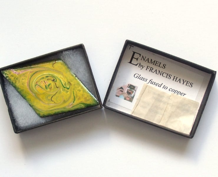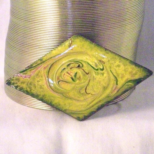 After building up a base of yellow enamel I added rods of pink, white and green then drew a steel point through the surface to generate the unique, random swirled pattern.