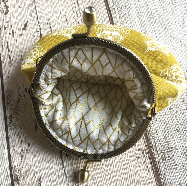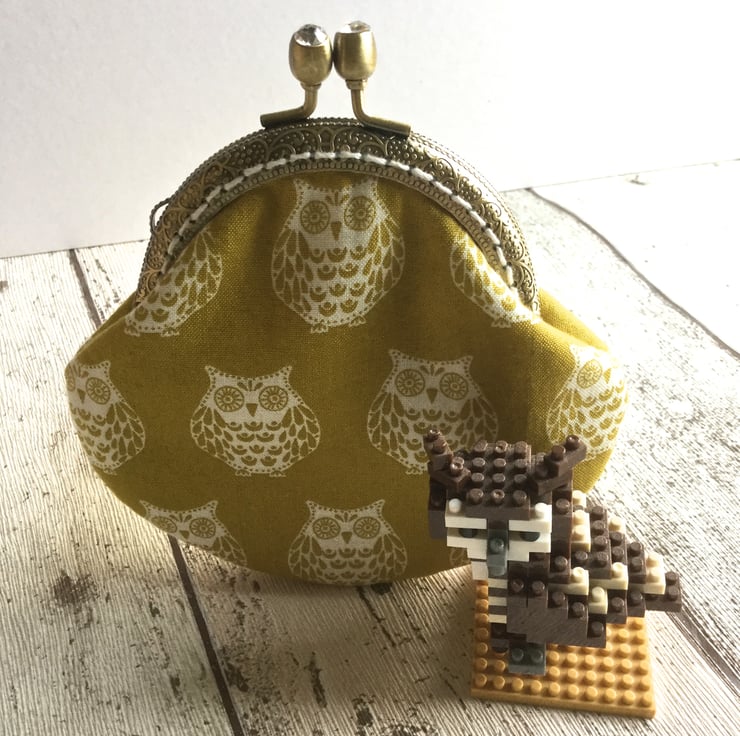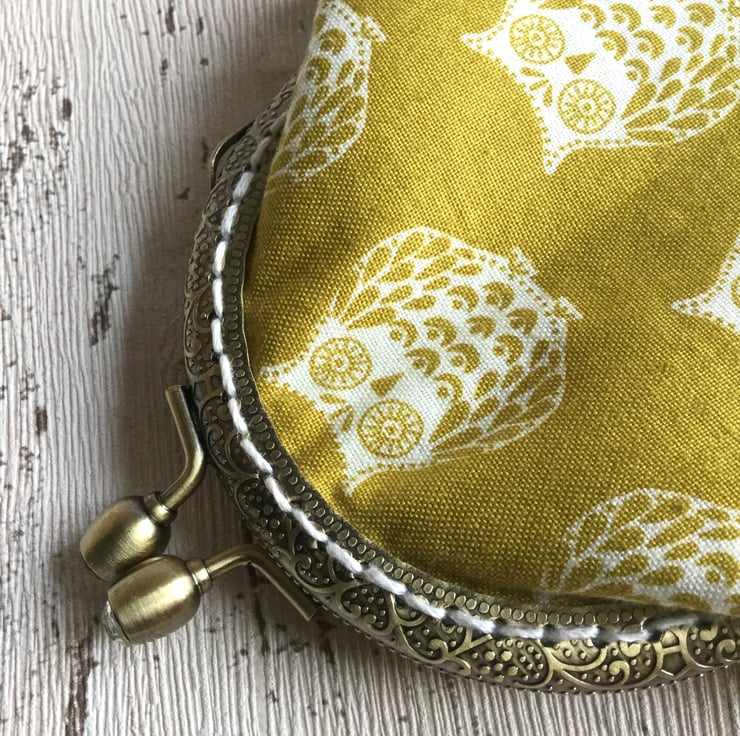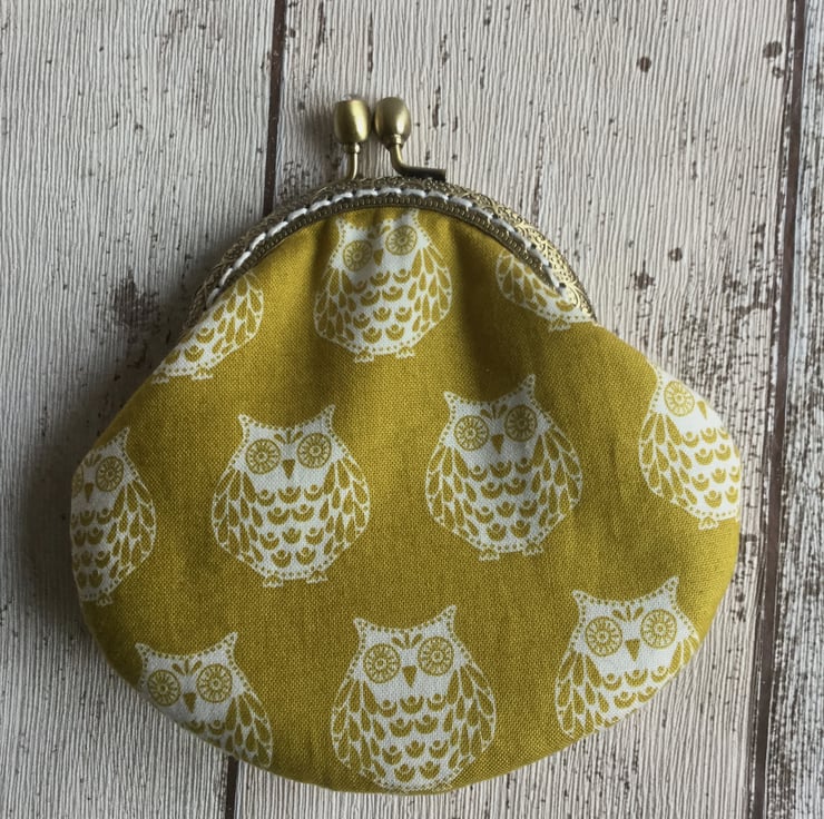 This cute little owl themed coin purse would put a smile on anyones face. The cotton fabric in a mustardy gold shade has a design of white owls. The antique bronze metal embossed frame has two tiny sparkly beads set within the clasp and is attached to the purse with white embroidery thread.