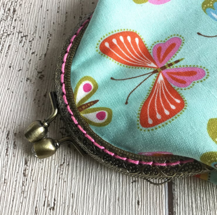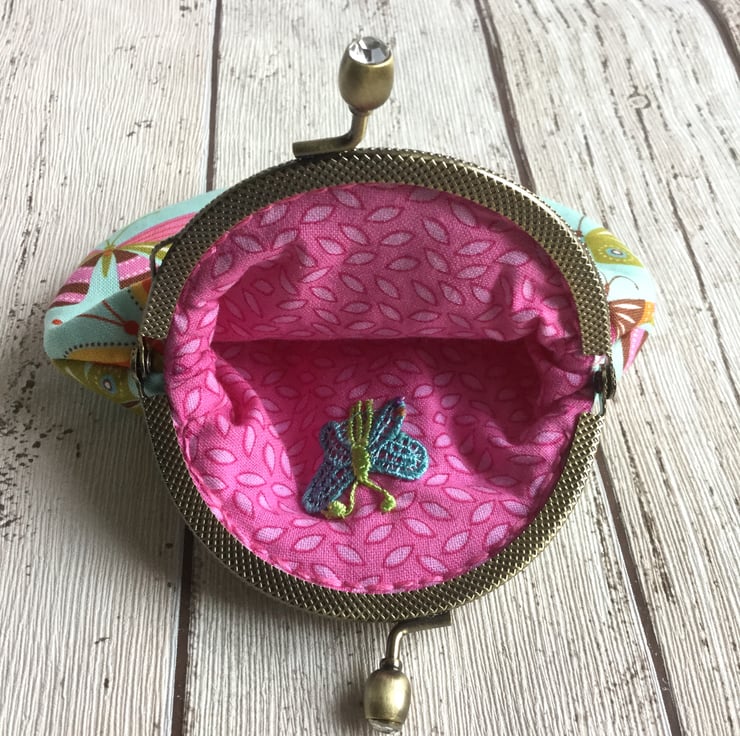 The antique bronze coloured metal embossed frame has tiny sparkly beads set within the clasp and is attached to the purse with pink embroidery thread.