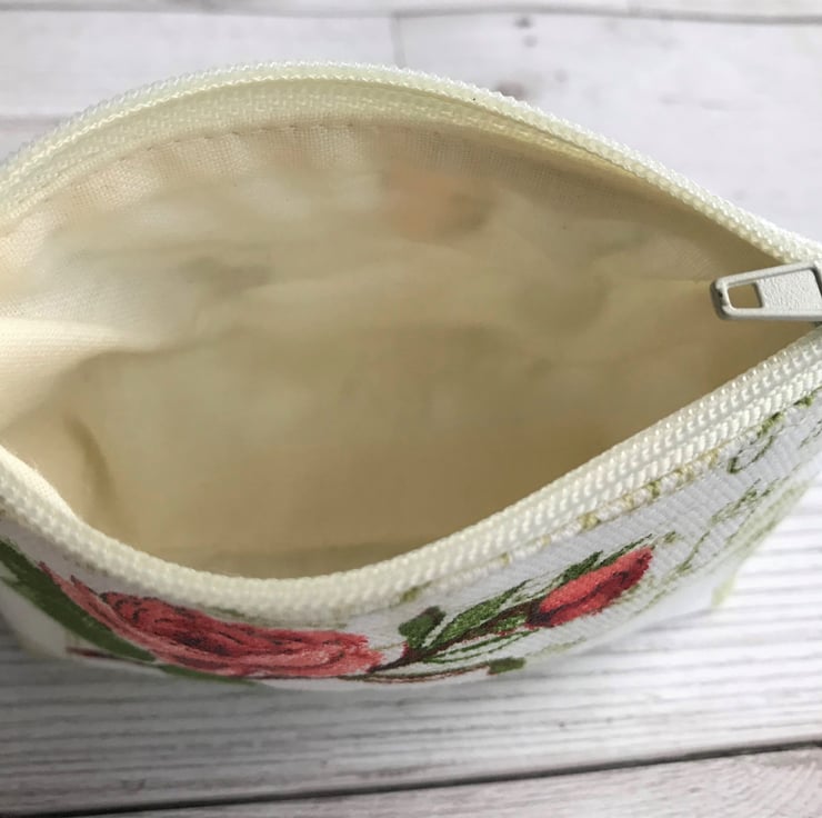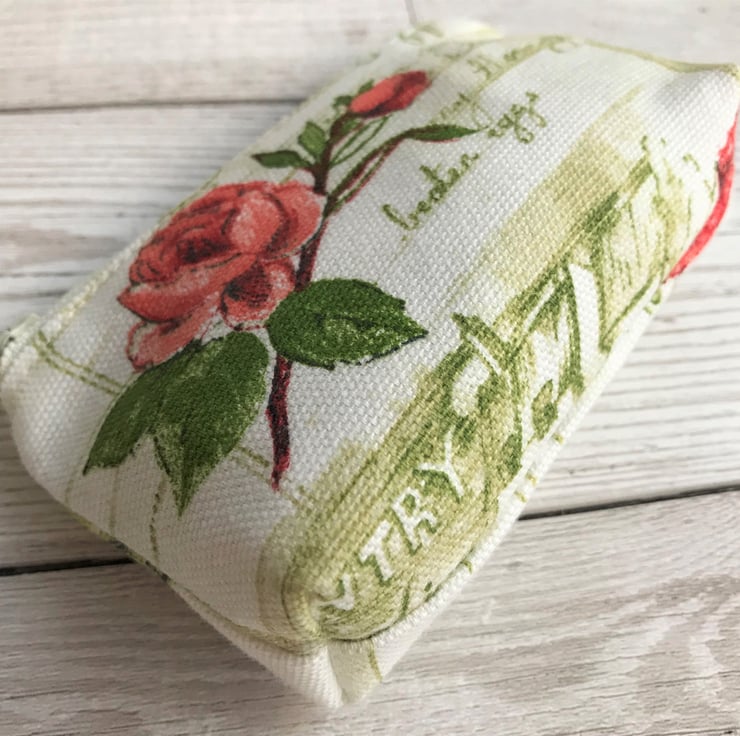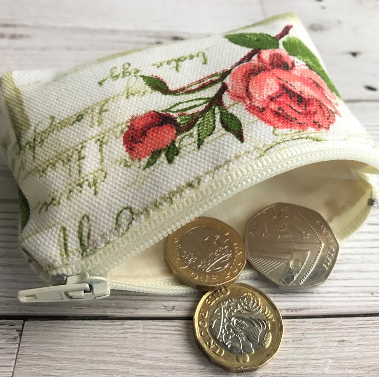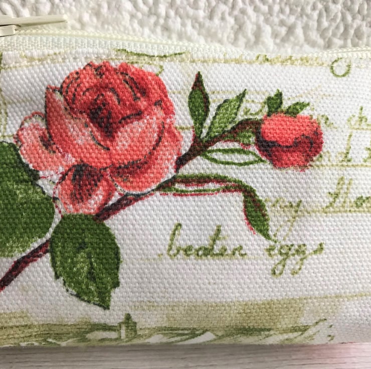 A small coin purse with a rustic print pattern featuring a salmon pink Rose and a rosebud on a leafy stem. The background is pale cream with a printed recipe in sage green script. The coin purse has a pale cream zip and is lined with cream fabric. The base of the purse is boxed to give a spacious interior.