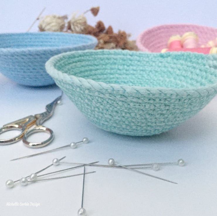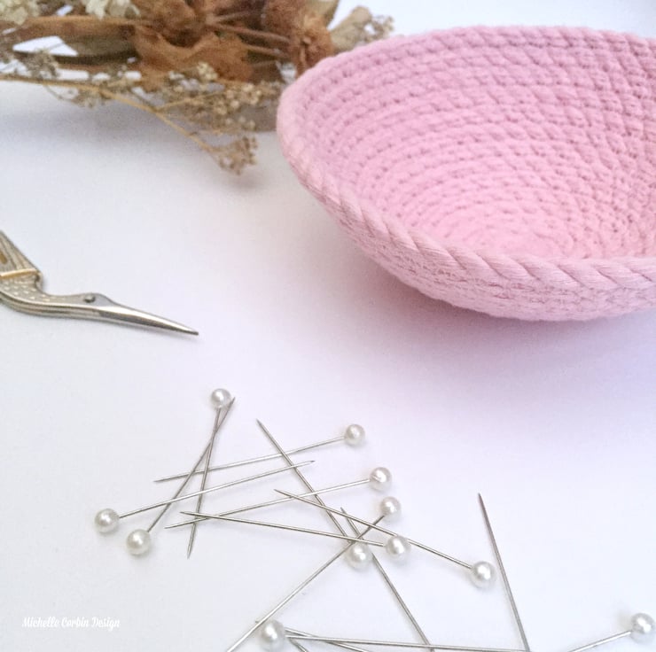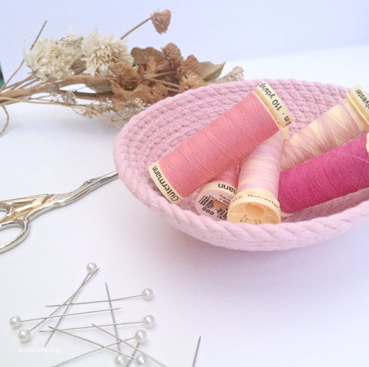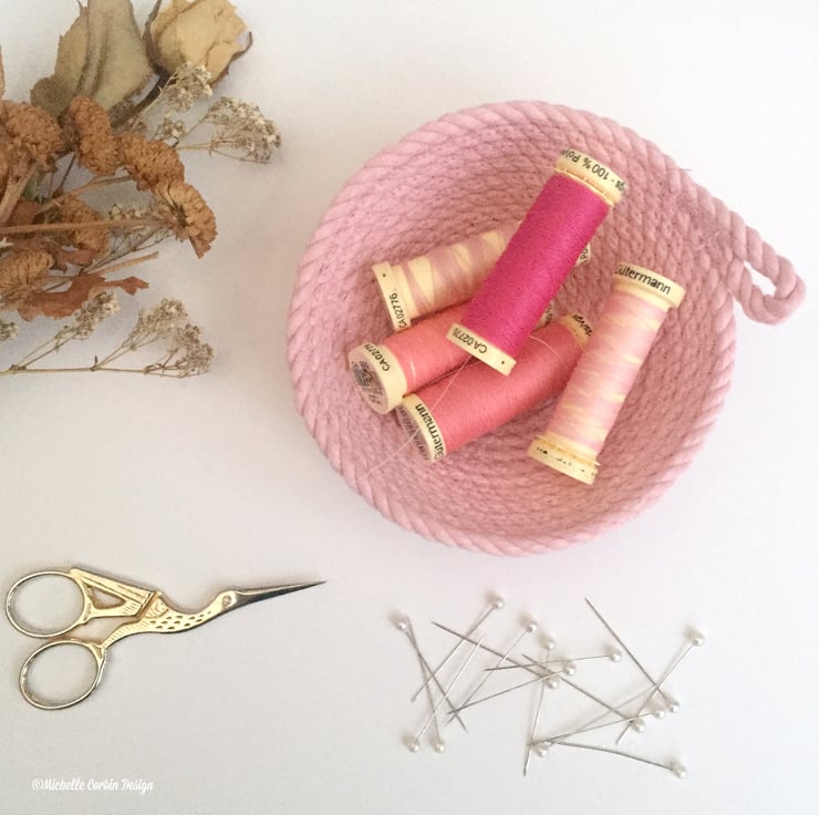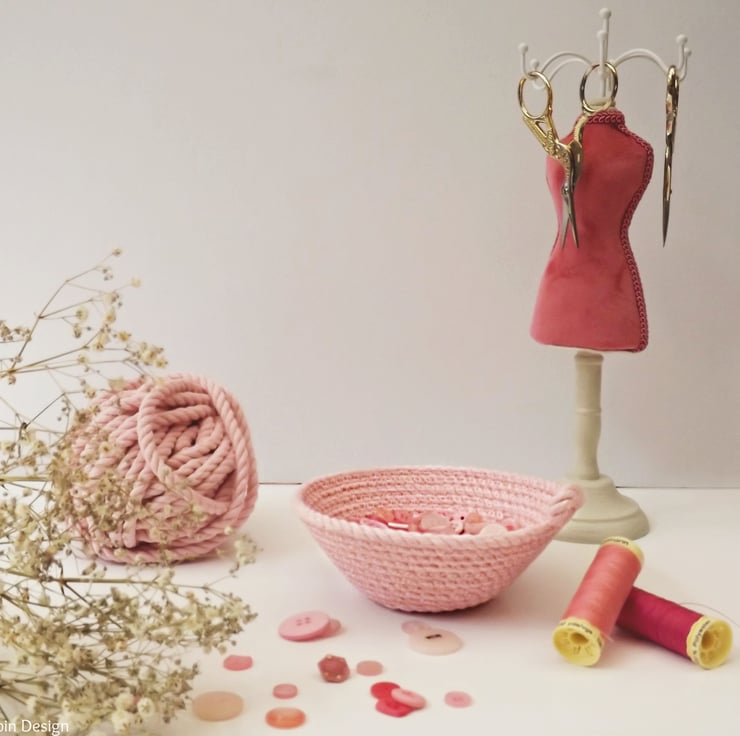 Created using a 5mm Pink Macrame Rope, the bowls make wonderful additions to your craft or workroom for storing those little notions you need to hand, from quilting clips and pins, to bobbins of thread. They have many uses and can be used as a photo prop, or as a wonderful decoration in your bedroom or bathroom. Whatever their use, you will love them. And will also make cute gifts.