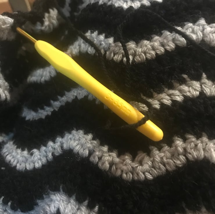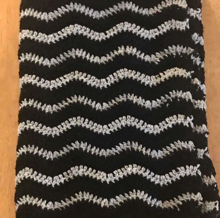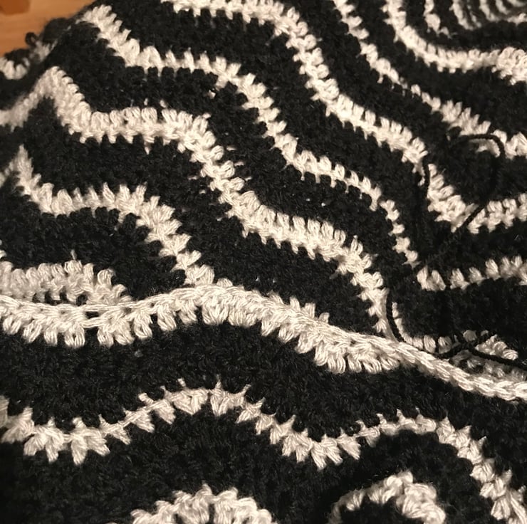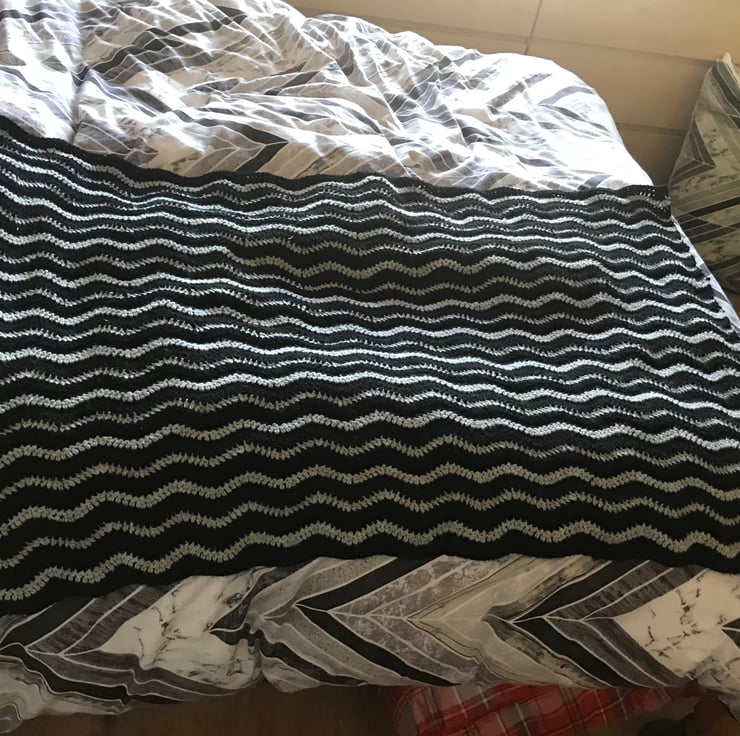 113cm x 83cm approximately handmade crocheted in black and light grey stripes in waves pattern