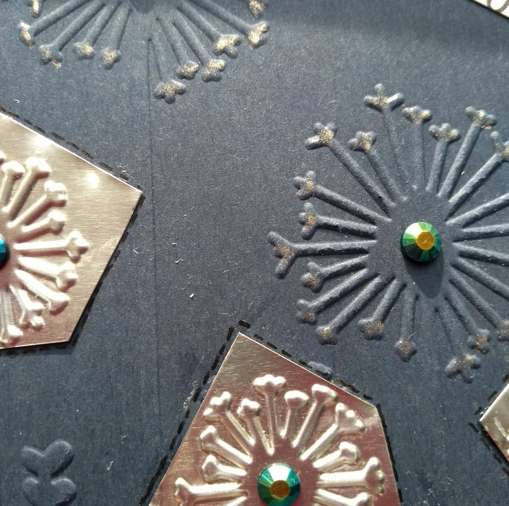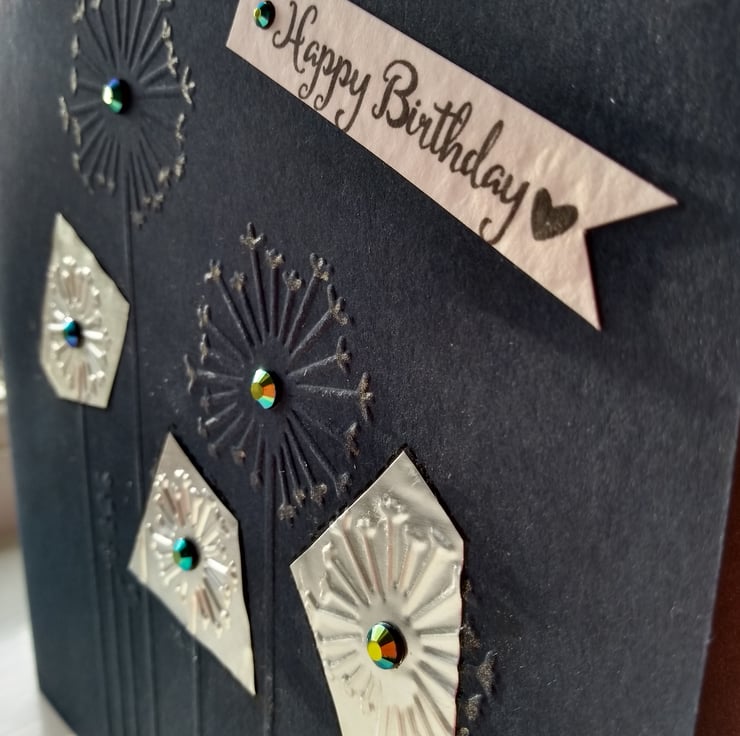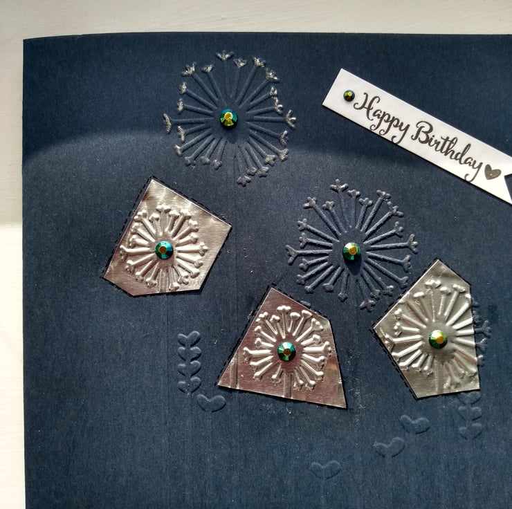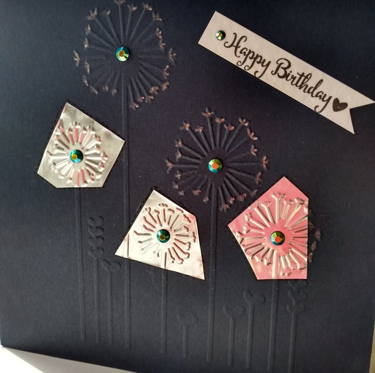 A completely handmade and uniquely designed card. Consisting of quality dark blue card which has been embossed with a dandelion design. Fine silver metal has been embossed with dandelion heads and cover three/green holographic beads in the centres. Finished off with happy birthday tag