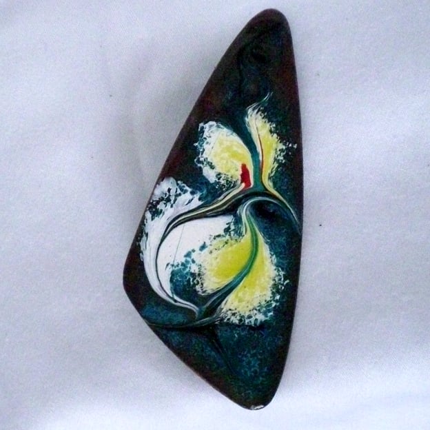 This brooch features a free-flowing scrolled design made by drawing a steel point through the white and gold enamel when it was red hot. There is a hint of red within the pattern too.The background colour is largely dark blue green through which the copper base of the brooch may be seen in rich brown tones.