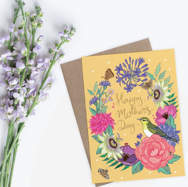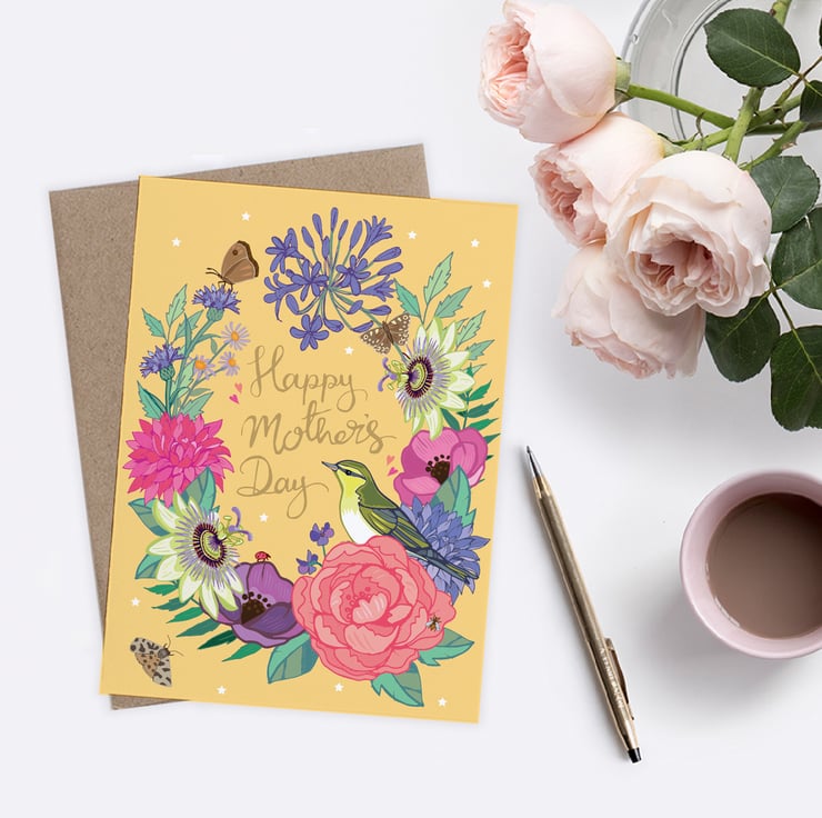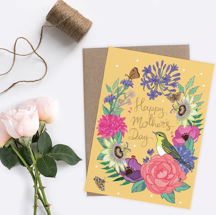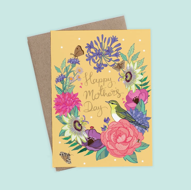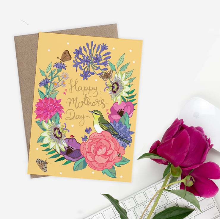 Floral Mother's Day Card on yellow with a little bird in a wreath of flowers.
