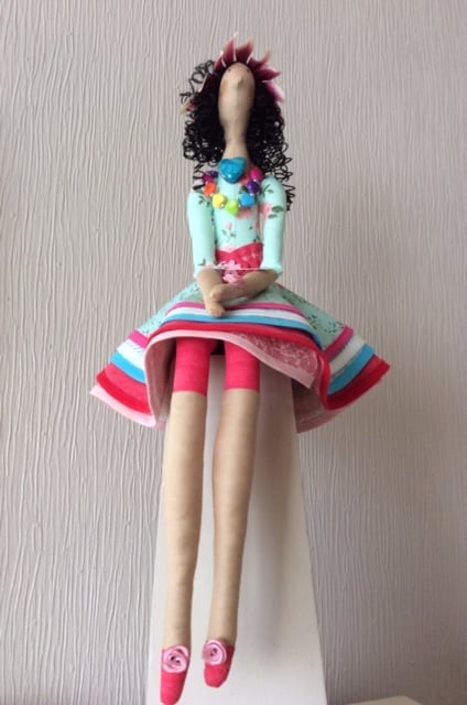 Meet Amelia. She is a tilda type tall thin dolly of approximately 57cm and is made from tea dyed cotton. She is made from tea dyed cotton with a light turqouise and rose patterned bodice to her dress which also has a multi-layered skirt which falls just below her knees. She has black ringlet hair and a pretty flower hat. He bright pink leggings fall to below her knees with pink shoes to match and pretty pink rose adornments. She is also wearing a multi-coloured heart shaped bead necklace with a deep turquoise heart at the neckline.
