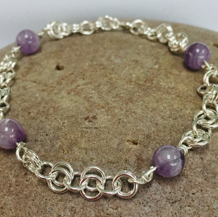 This bracelet is made from sterling silver chain links with beautiful amethyst gemstone beads. It is finished with a sterling silver bolt ring.