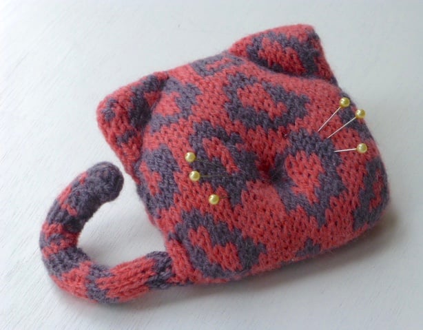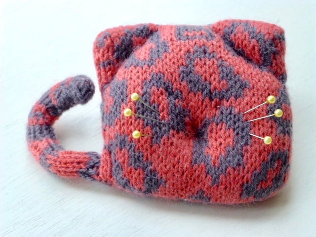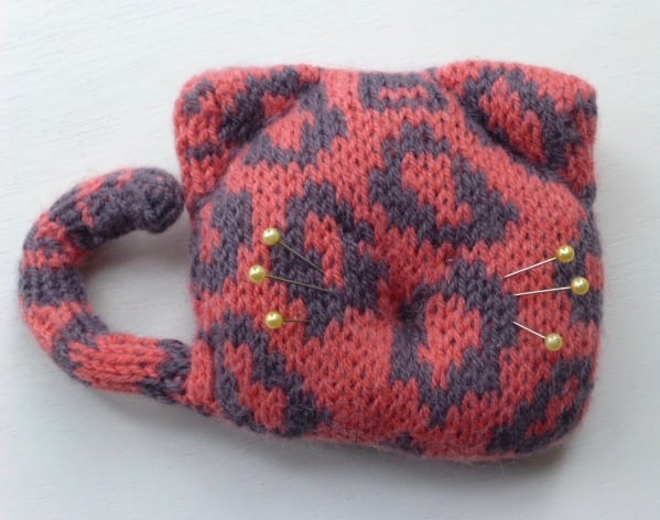 One for the cat lovers. A knitted pincushion in the shape of a stylised cat. The background is my version of a leopard print. It comes complete with a curly tail.