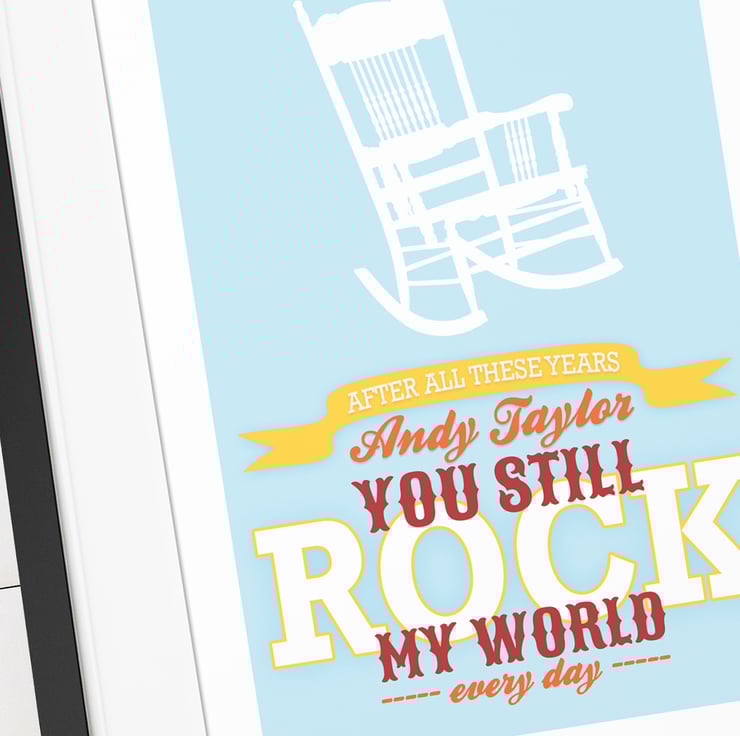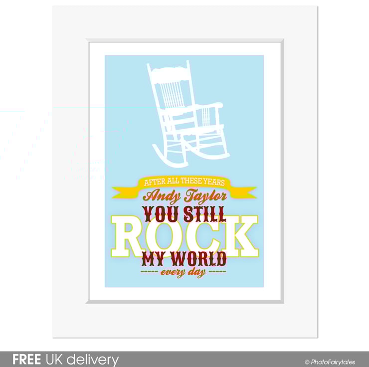The wording on the print is: "After all these years (chosen name) you still rock my world every day"