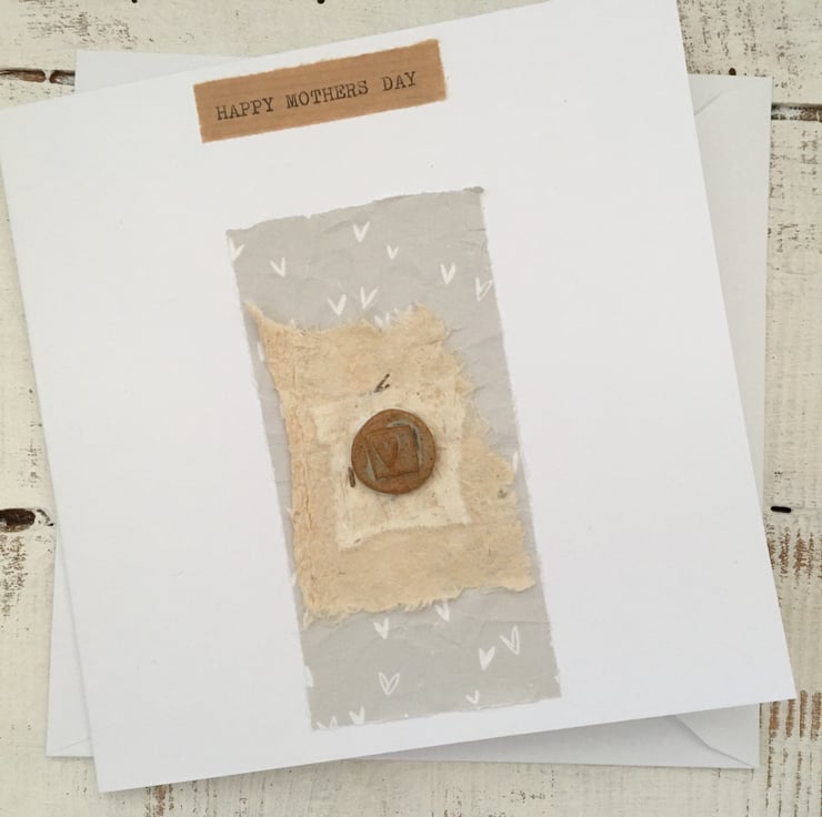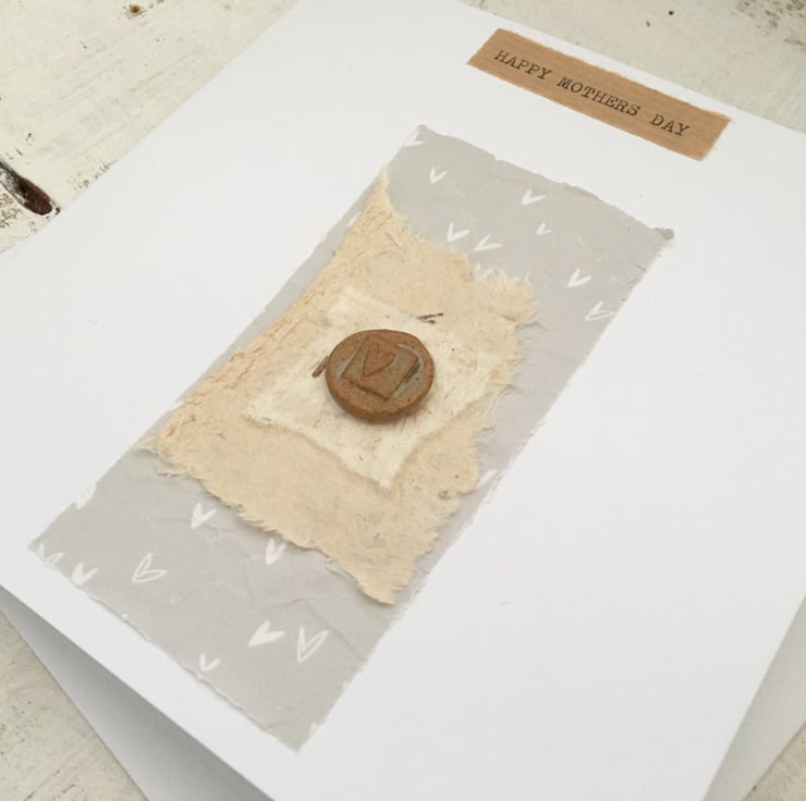 A beautiful one off Mothers day card made with hand made papers and a hand made Love heart ceramic gift.