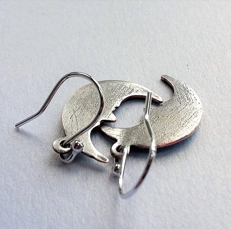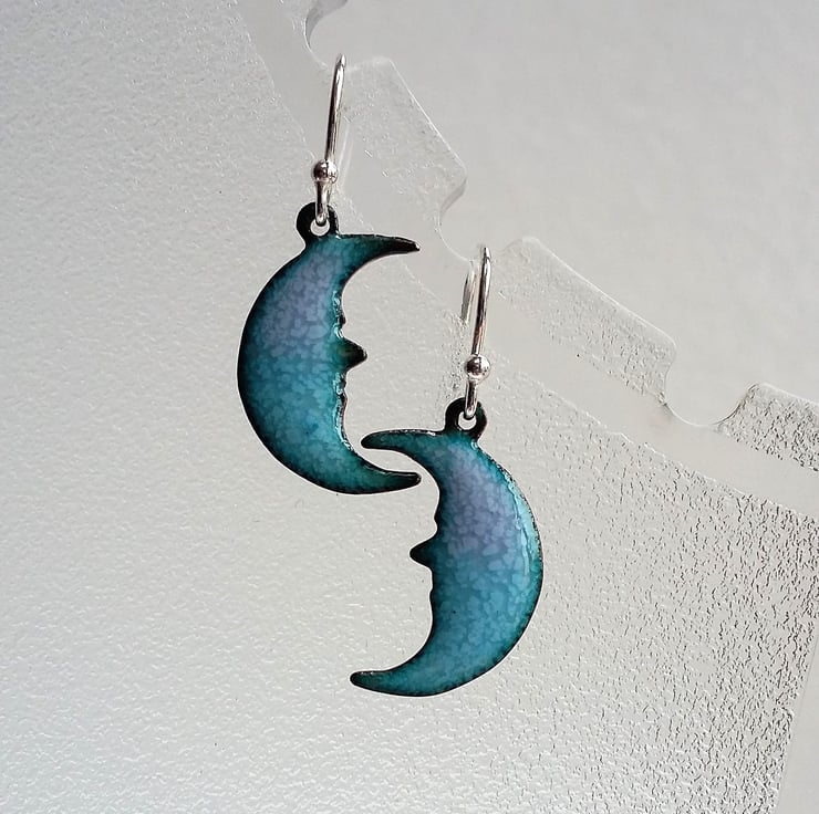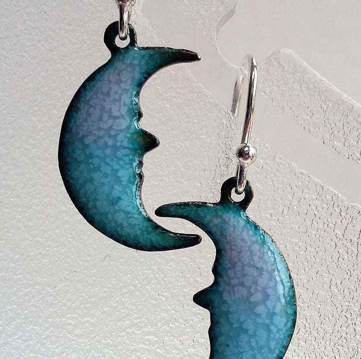 A pair of crescent moons in beautiful turquoisey blue and pale pink. The earrings have been kiln-fired and each measures approximately 17mm between the two points with the distance from the tip of the nose across the back being about 9mm, and come complete with sterling silver earring wires. The backs have been given a light silver plating to give a polished effect. They are supplied with a little organza pouch and POSTAGE IS FREE!