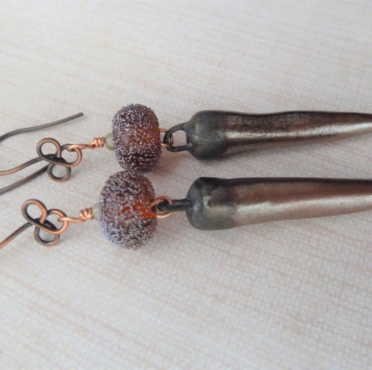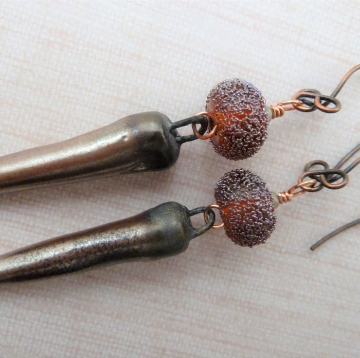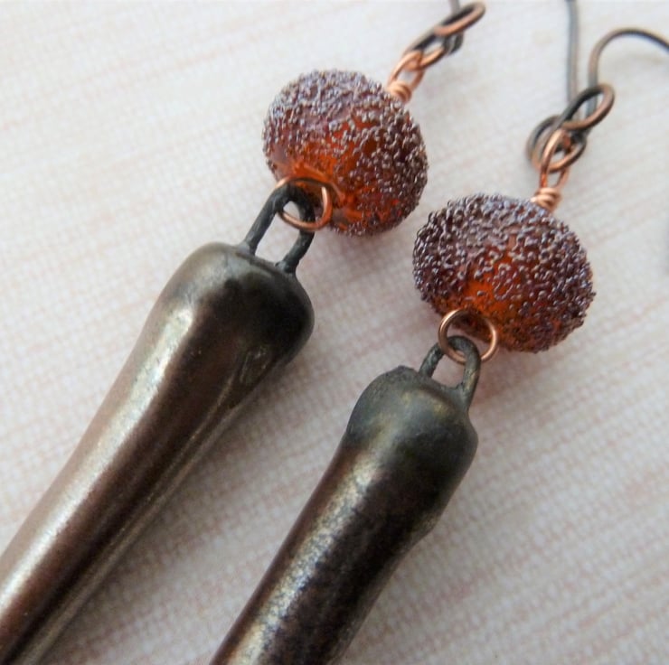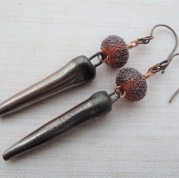 A pair of earrings made with handmade copper ear wires, handmade lampwork glass beads made with amber glass and handmade ceramic spikes with a bronze glaze.