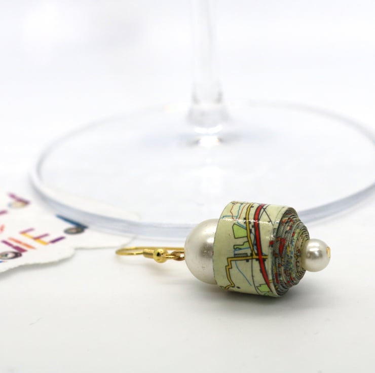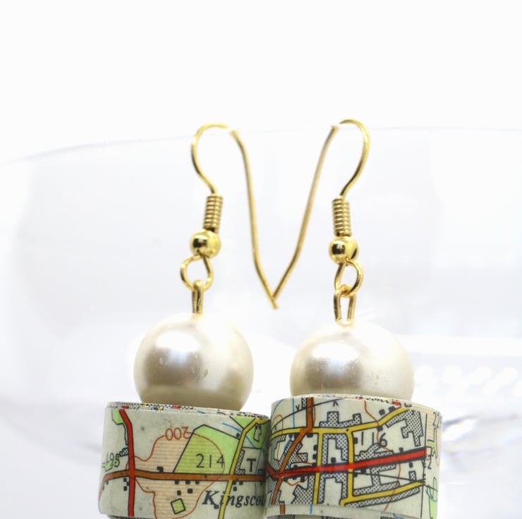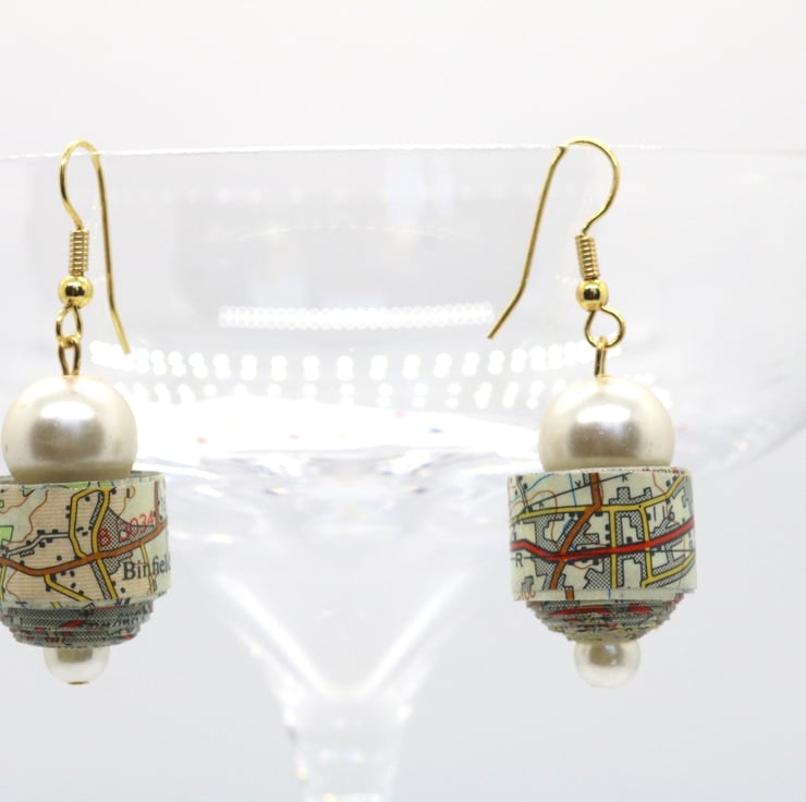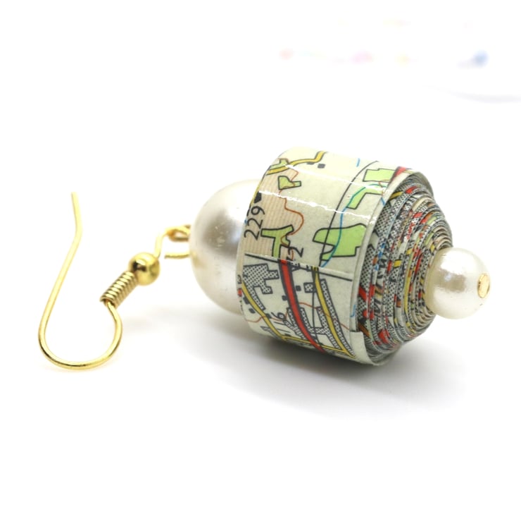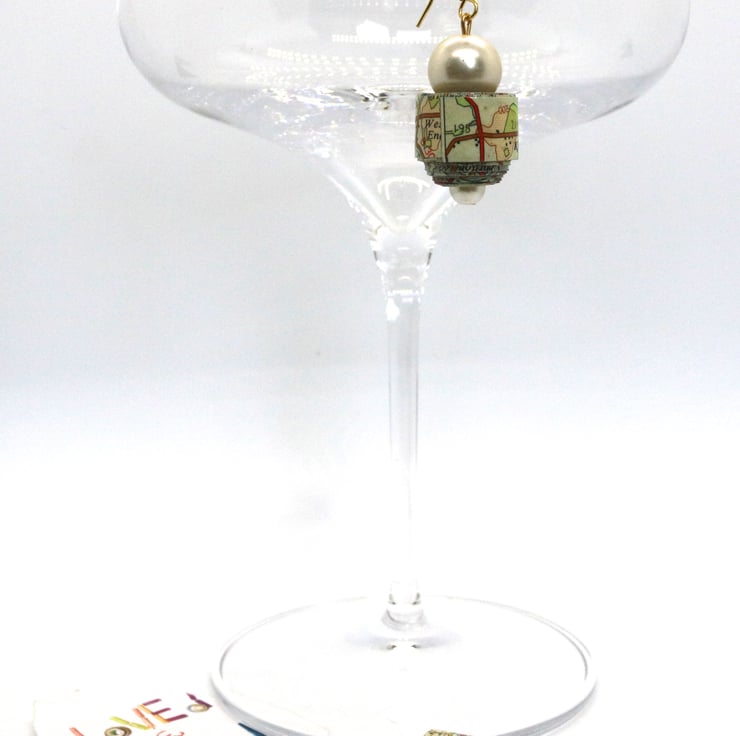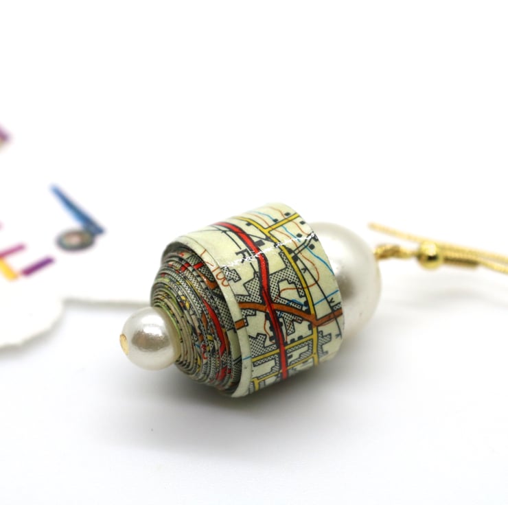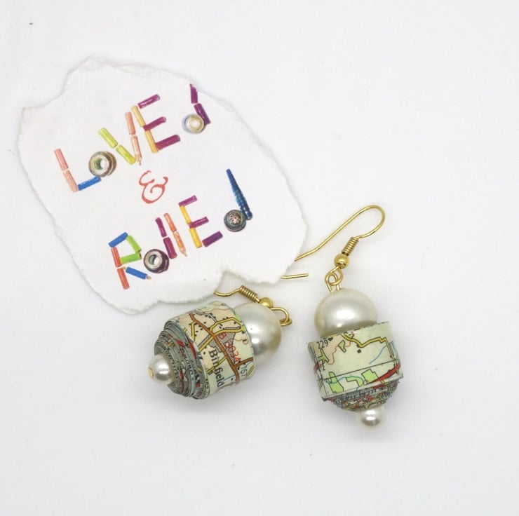 I have used an old OS map (1962) of Greater London to make these paper beaded earrings. The map was cut into strips, hand rolled into beads which were then varnished and finished with pearl beads. The beads are mounted on gold plated earring hooks