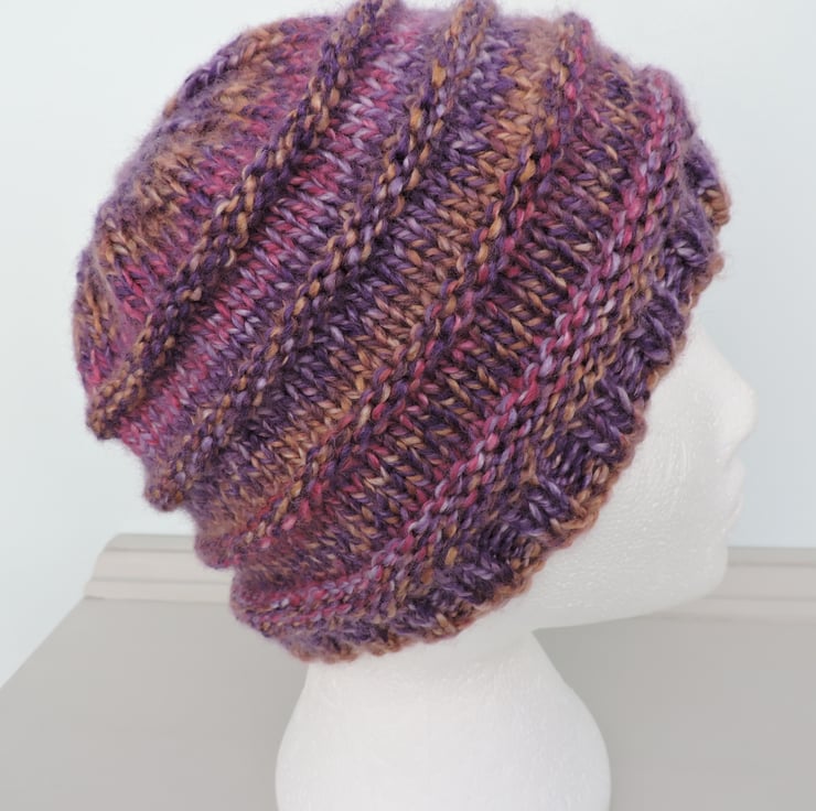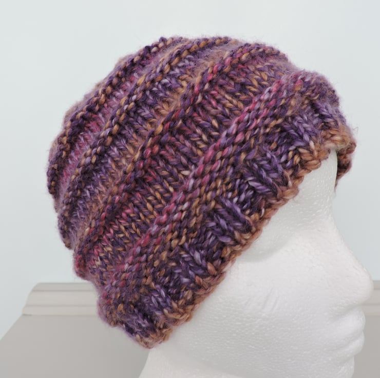 50% off SALE now £5.00 This mottled tweed effect adults knitted beanie hat has been made using a chunky premium acrylic yarn. Pretty colours of purple, toffee and magenta.