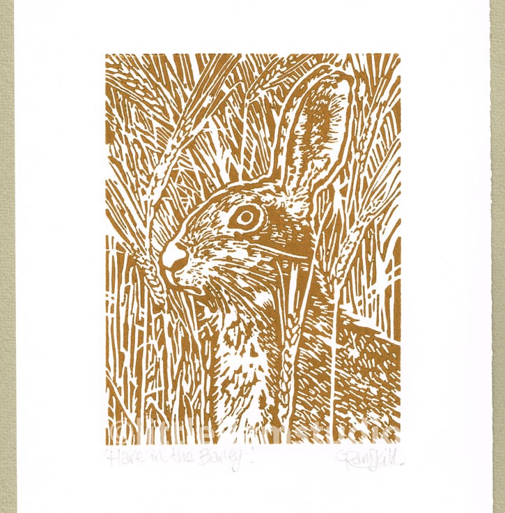 Hare print - 'Hare in the Barley' - Original, hand pulled Linocut Print, printed on hand press. Supplied in a cream mount so all you need is a frame!