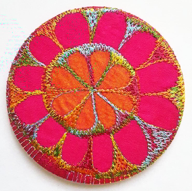 Made from layers of fabric including hand dyed Egyptian cotton and silk fabrics using the free machine embroidery style of sewing.