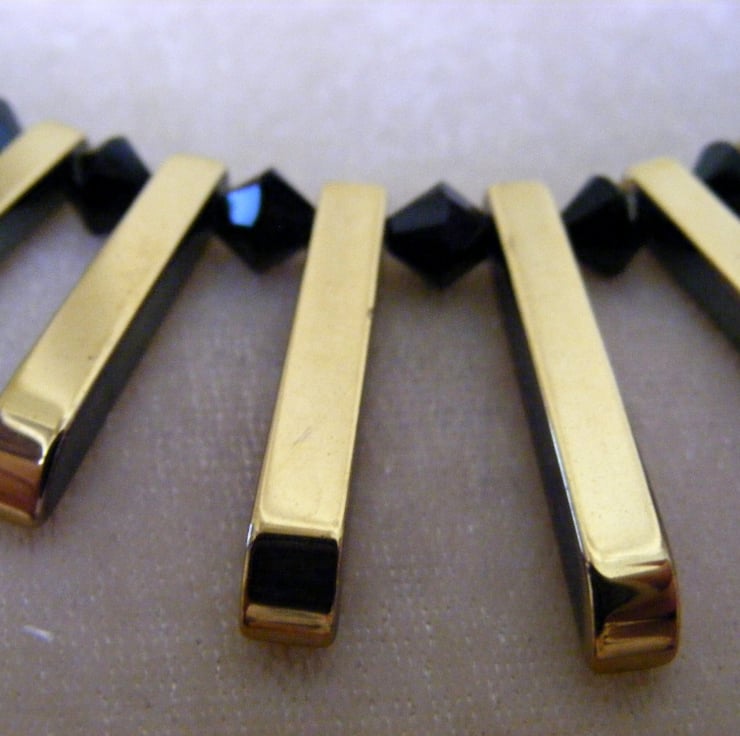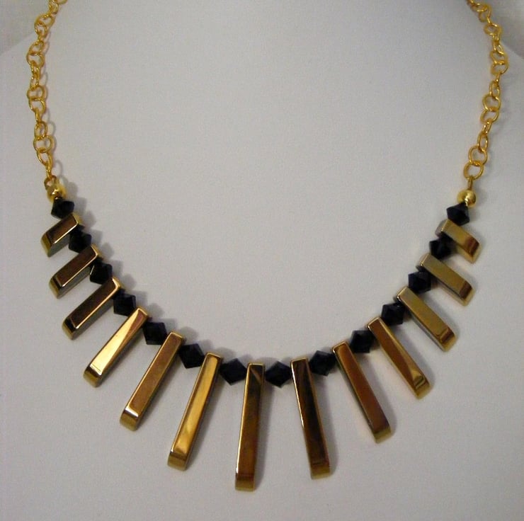 Necklace is made with gold colour graduated hematite bars, 6 mm Swarovski jet crystals, gold plated oval link chain, gold plated findings and lobster clasp.