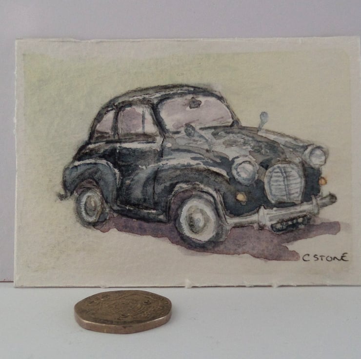 This is a standard size ACEO of 2.5 x 3.5 " (64 mm x 89 mm). ACEOs (Art Card Editions and Originals) are highly collectable original artworks, the size of a standard trading card. They can be mounted, framed or presented in an album.