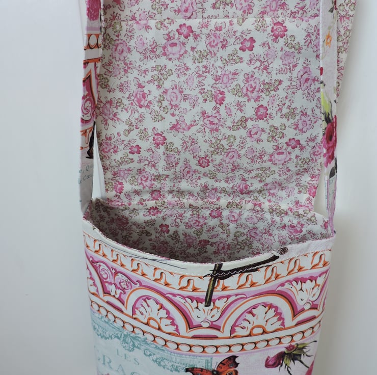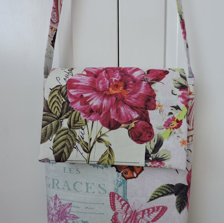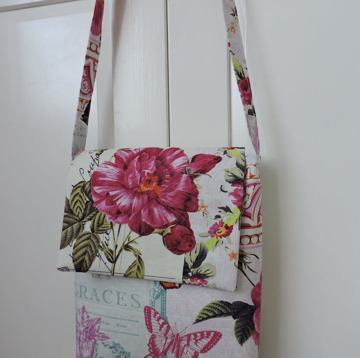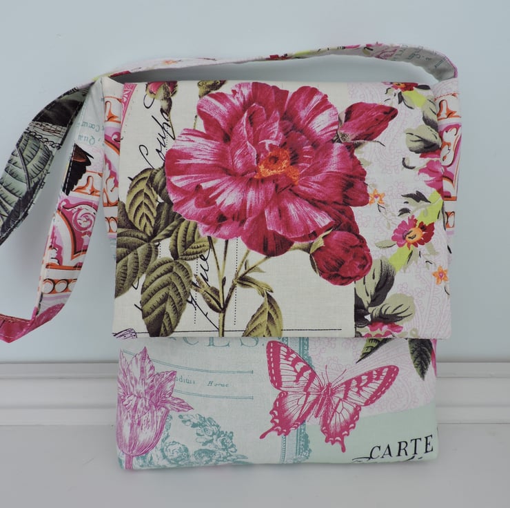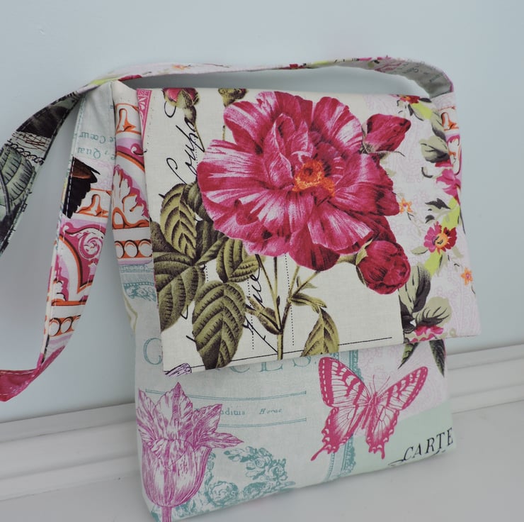 I've made this pretty little messenger style handbag with a cotton floral fabric, a white background with pink. green, pale turquoise and black with roses, butterflies, leaves and script Fully lined with a poly cotton floral fabric in complimentary colours.