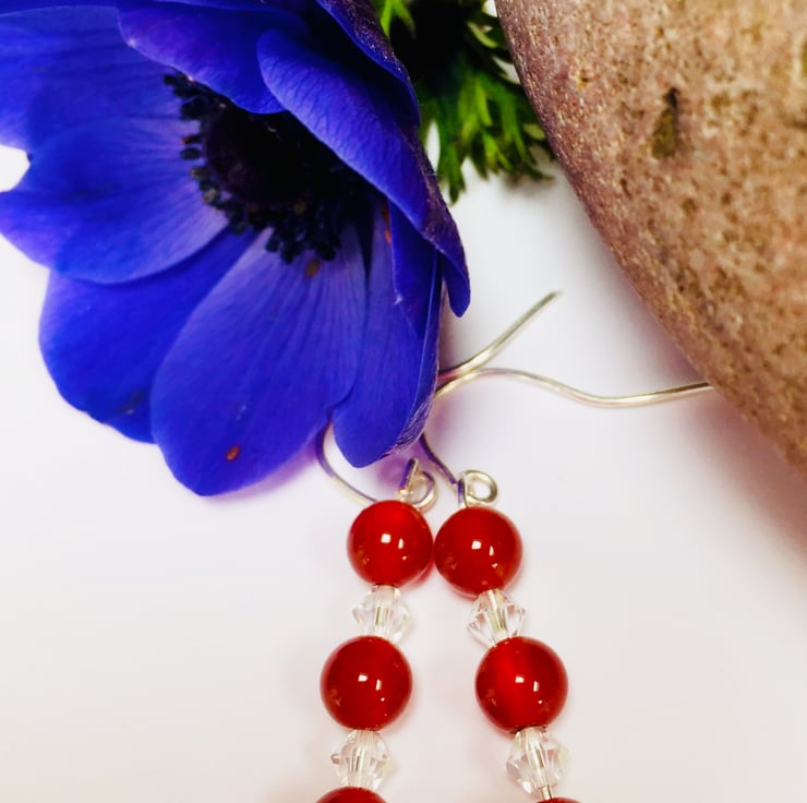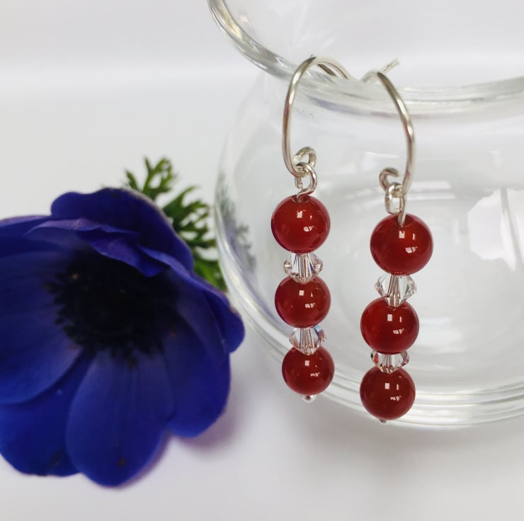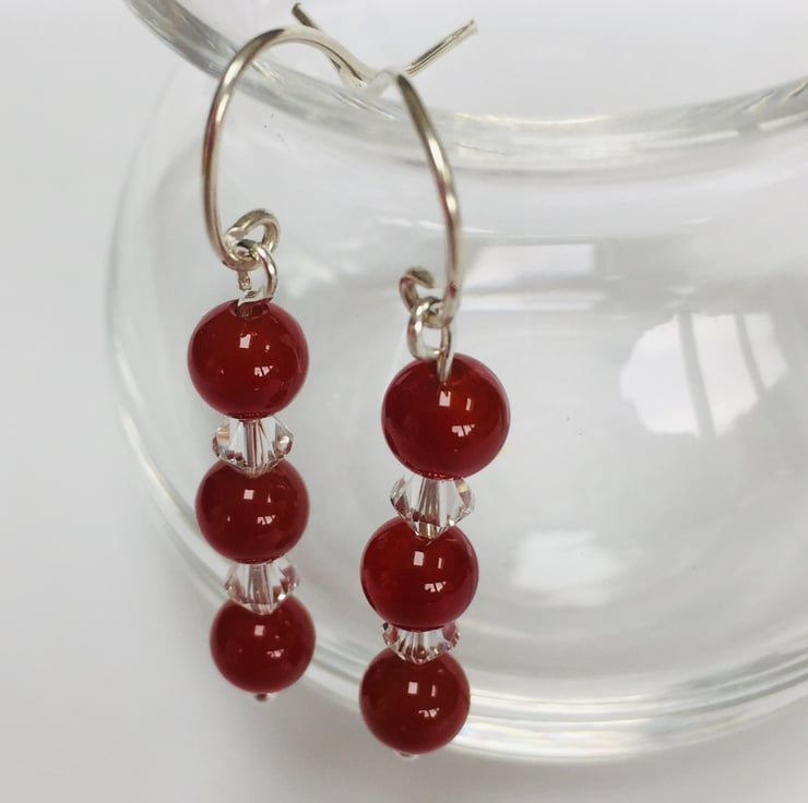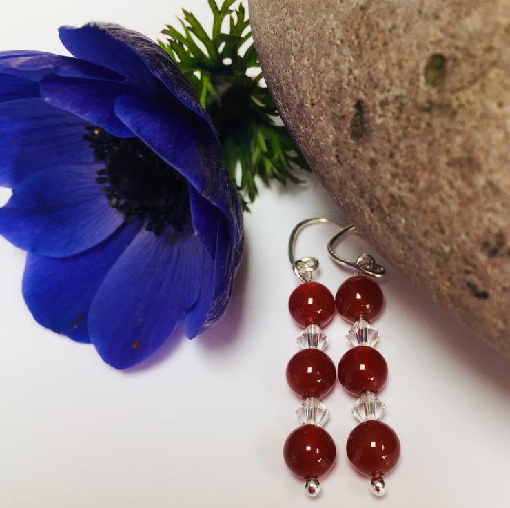 These elegant earrings are made from sterling silver with red Carnelian gemstones and Swarovski crystals. They have handcrafted sterling silver fittings. The perfect gift for any occasion.