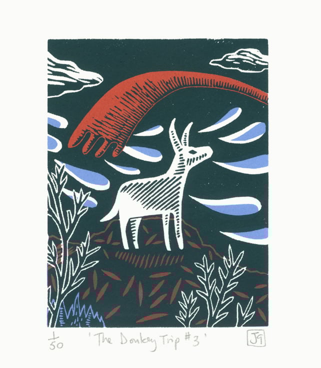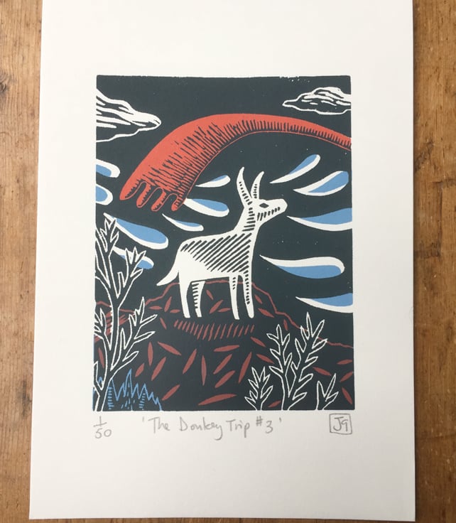 An A6 size linocut/screen-print entitled 'The Donkey Trip No.3'.
