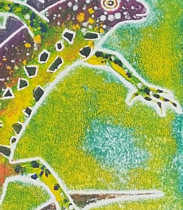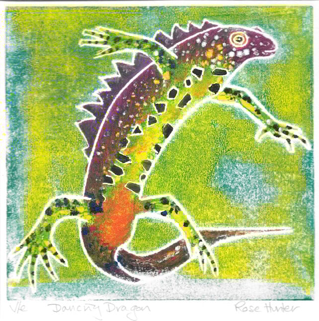 Dancing Dragon depicts a Great Crested Newt. It is a hand painted monoprint from a lino block and printed on a hand press with finishing details in water based drawing inks. The background is in green and yellow and the newt is multi-coloured with a purple crest and a warm orange and yellow belly.