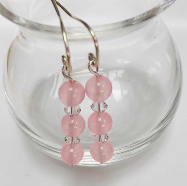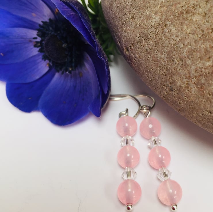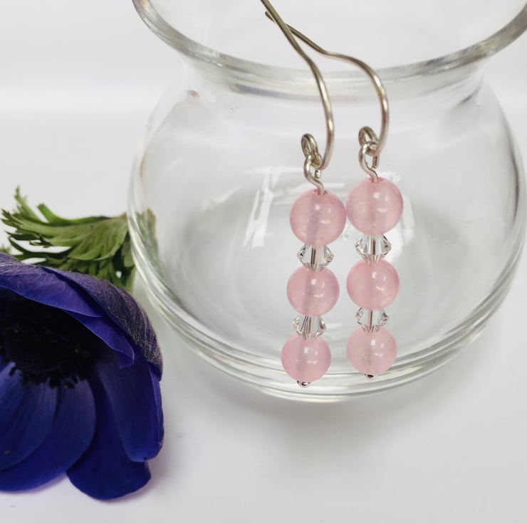These elegant earrings are made from sterling silver with pretty pastel pink rose quartz gemstones and Swarovski crystals. They have handcrafted sterling silver fittings. The perfect gift for any occasion.