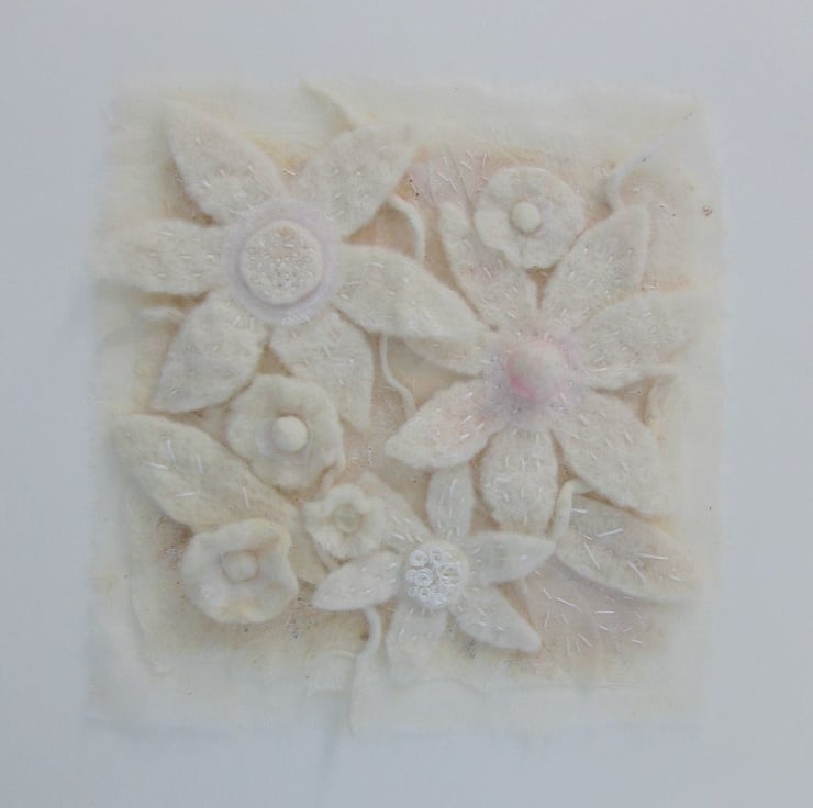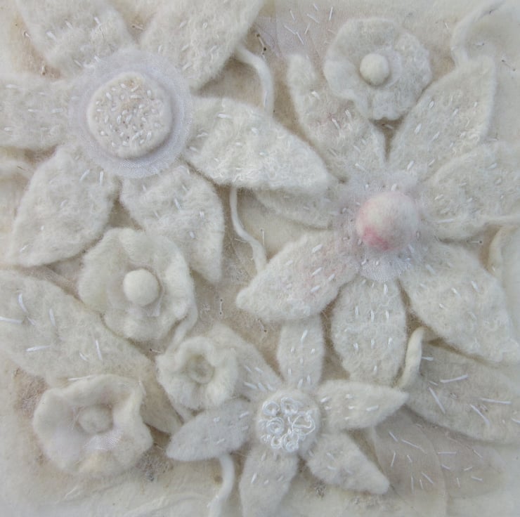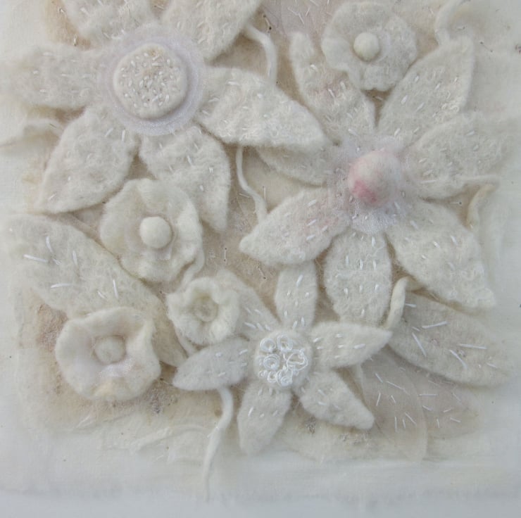 Leaves and flowers made from hand made felt and mounted onto a silk paper fibre background. The flowers and leaves have been decorated with hand stitching and organza to give a rich decorative 3D surface. The flowers are a creamy white and there is a tiny hint of pink fibre.