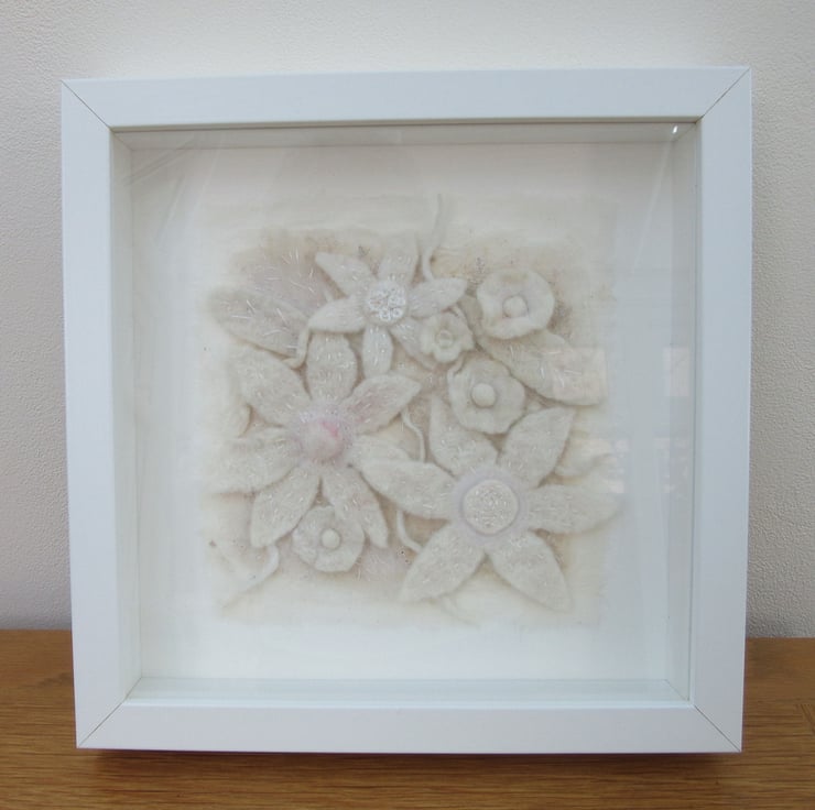 Modern white flower picture. Made from hand made felt using off white merino wool and silk. Fibre flower garden in white frame.
