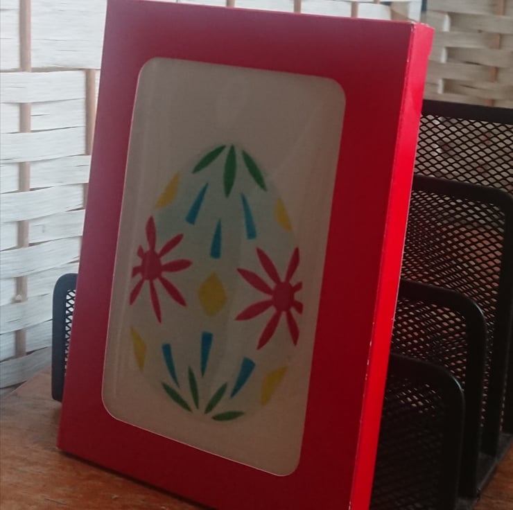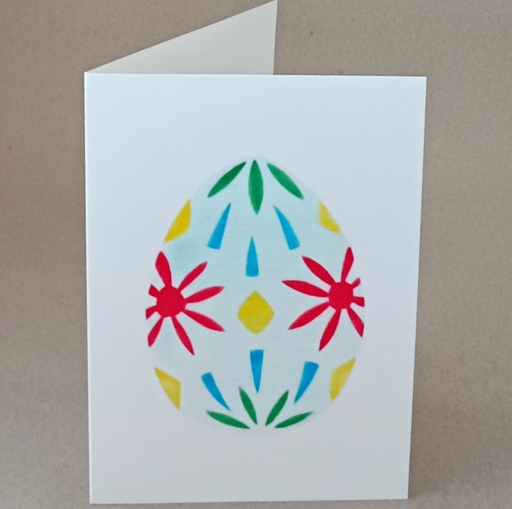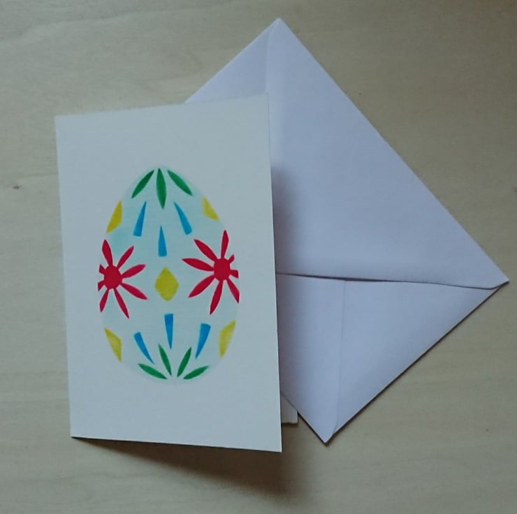 Colourful habdmade Easter card design of a painted egg which I made from hand cut stencils and then airbrushed onto laid paper.