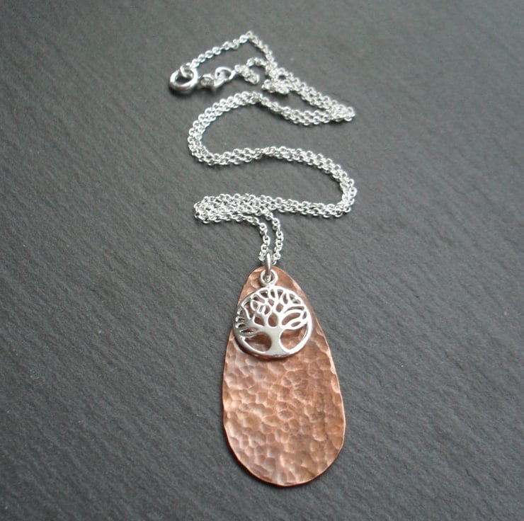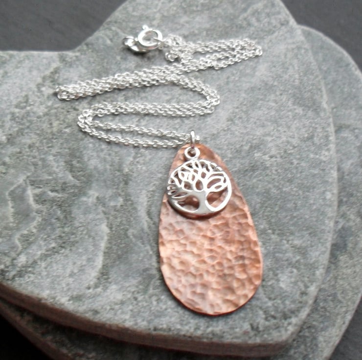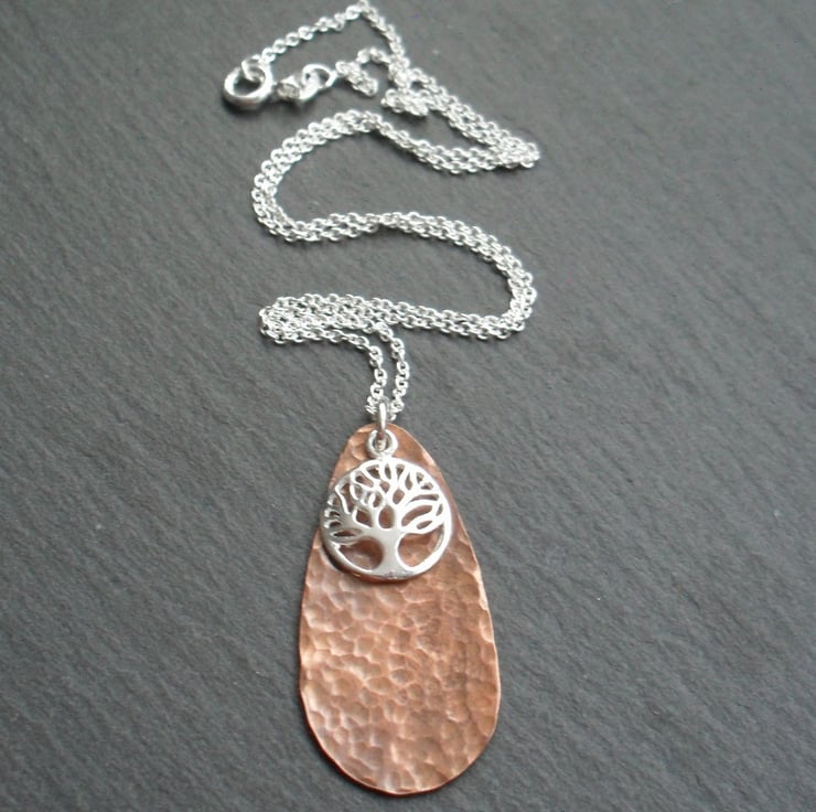 Copper tear drop pendant which has been cut from a sheet of copper then the pendant has been ,sanded, hammered to give texture, oxidised to give a aged look. the copper then has had a coat of lacquer to help protect the petina