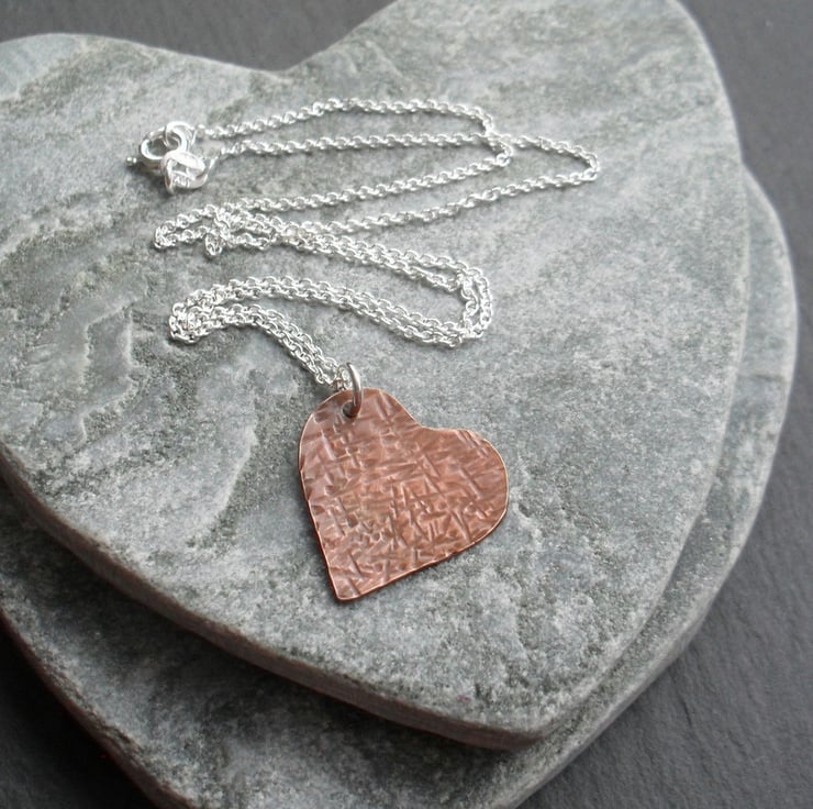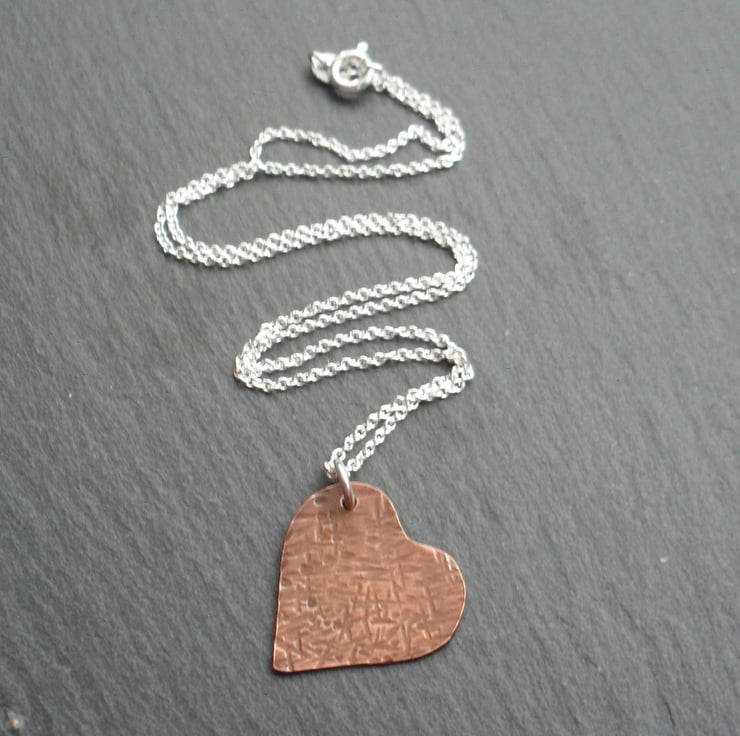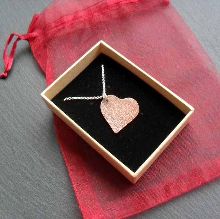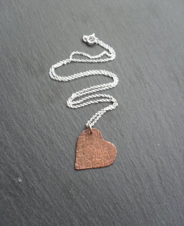 Copper heart pendant which has been cut from a sheet of copper then the pendant has been ,sanded, hammered to give texture, oxidised to give a aged look. the copper has then had a coat of lacquer to help protect the petina