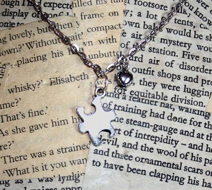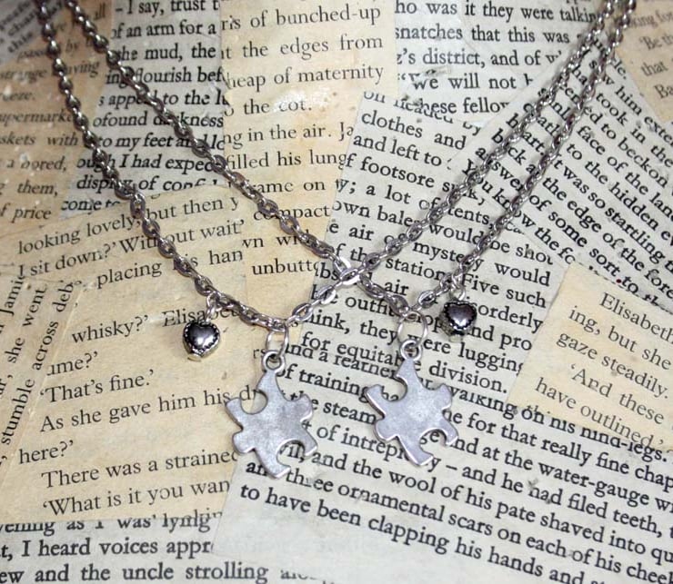 Each necklace features a Tibetan silver puzzle piece charm and an embossed stitch heart, hanging from a silver tone chain. These make a perfect gift for a best friend, bridesmaid or loved one.