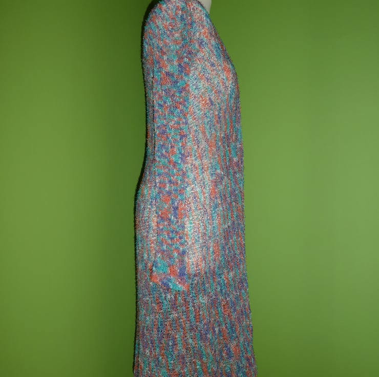This cardigan is designed to be worn with plenty of swirls and drape and looks fabulous over jeans. It can be worn open, but looks equally good with a large brooch or belt.