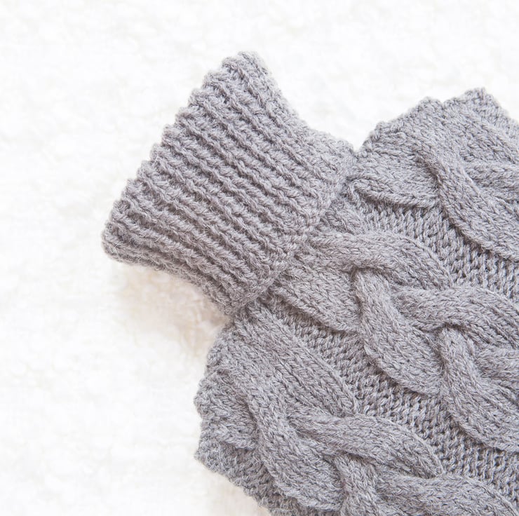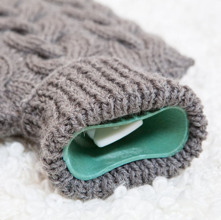 Hand knitted hot water bottle cover, cosy in grey. Rustic bedroom, home decor