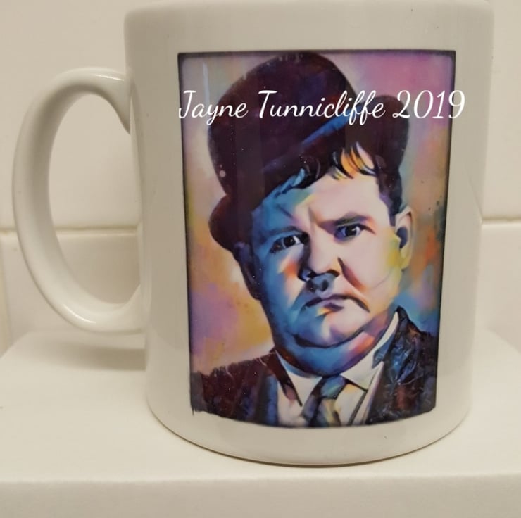 A lovely ceramic mug/cup featurung Oliver Hardy from an original design by Jayne Tunnicliffe.