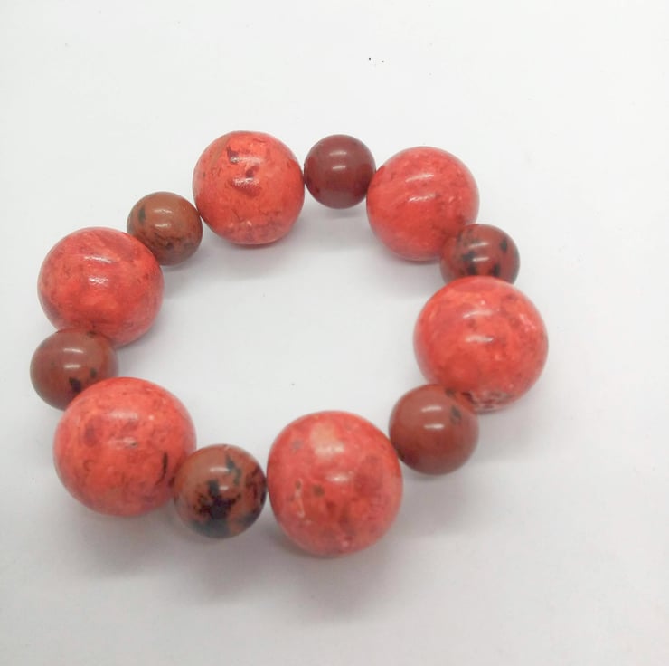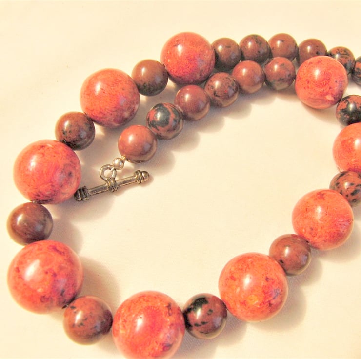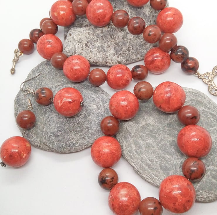 This stunning jewellery set is made using 20 mm round red pressed coral beads and 12 mm round mahogany jasper beads. The necklace is secured by a silver plated toggle clasp, the bracelet is threaded on to jewellers elastic and can stretch to fit most wrist and the earrings have silver plated ear wires.