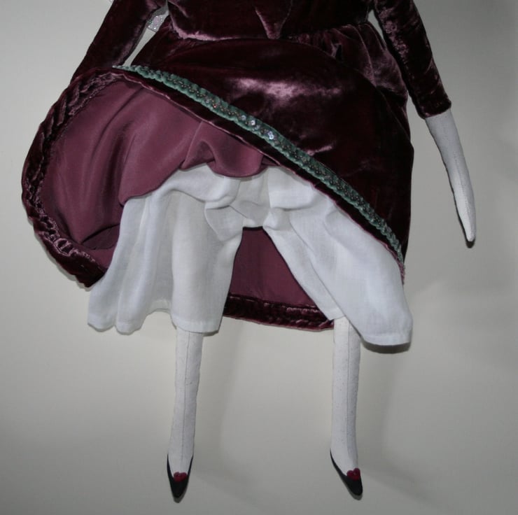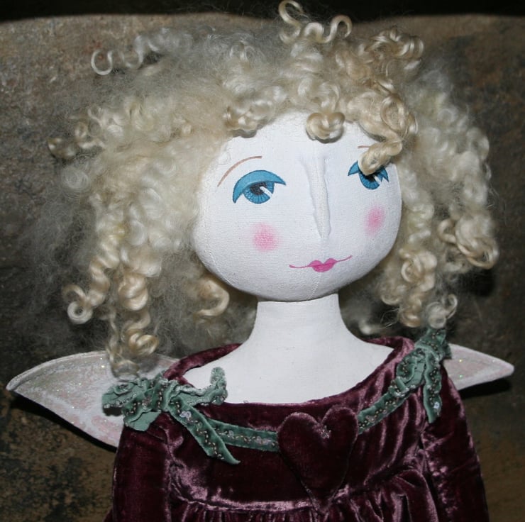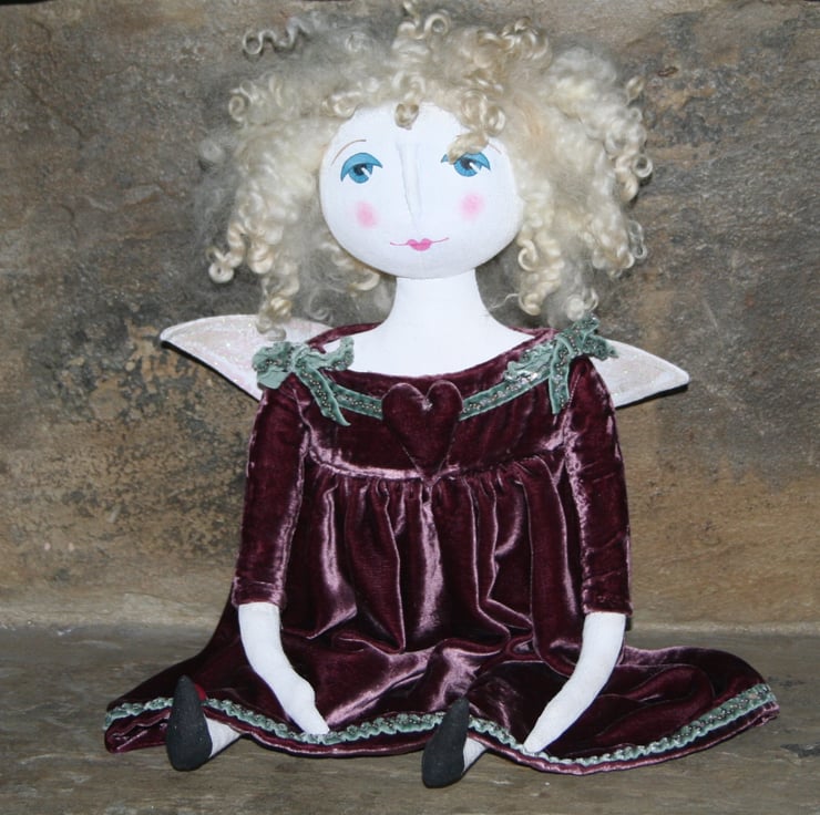 Angel of Love is made from painted Osnaburg (cotton ) fabric which has been lightly sanded so that she has a nice smooth complexion.She is quite a big girl and measures about 53 cms. and is about 34 cms. sitting. Her hair is washed (of course - angels like to have nice clean hair ) Leicester Longwool fleece .Her dress is a deep dusky pink silk velvet ,trimmed with a dusky turquoise velvet ribbon adorned with tiny silver sequins and the velvet heart has a tiny silver star seqin attached.Her shoes are also triimed with heart shaped buttons. Her wings are painted fabric wihich i have then dusted with a really fine glitter. She also comes with 2 velvet hearts which you can display on her lap.