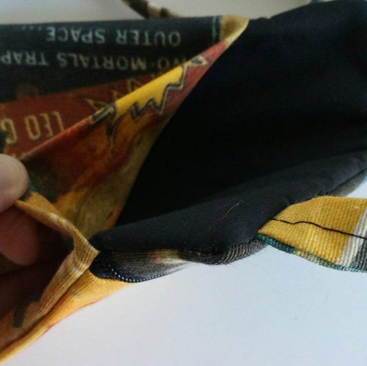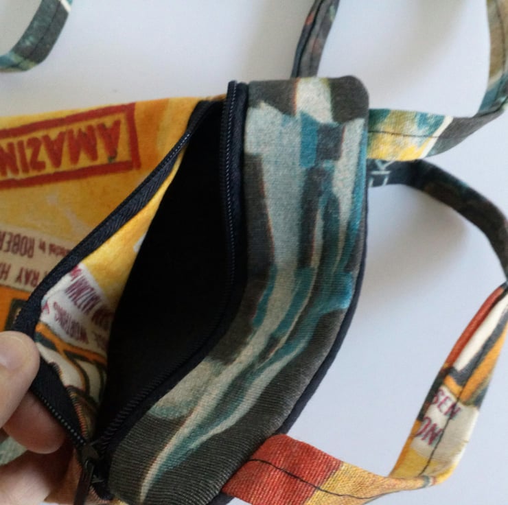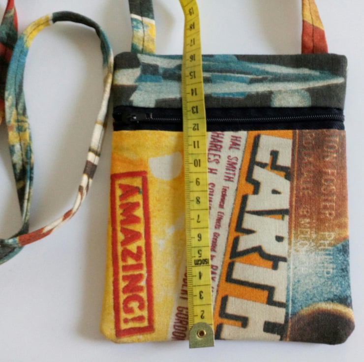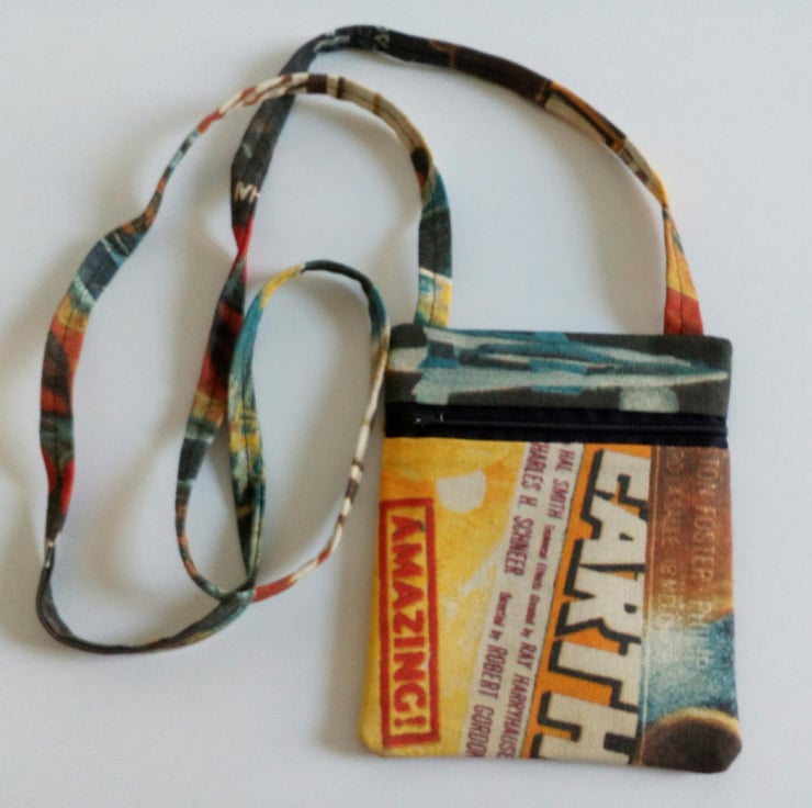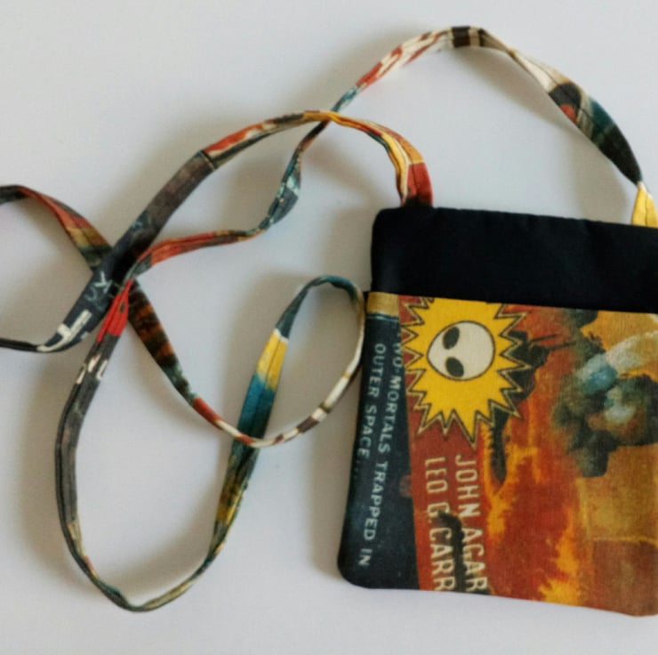 Crossbody bag, lined and featuring a Science Fiction graphic design. It has a black fabric back.