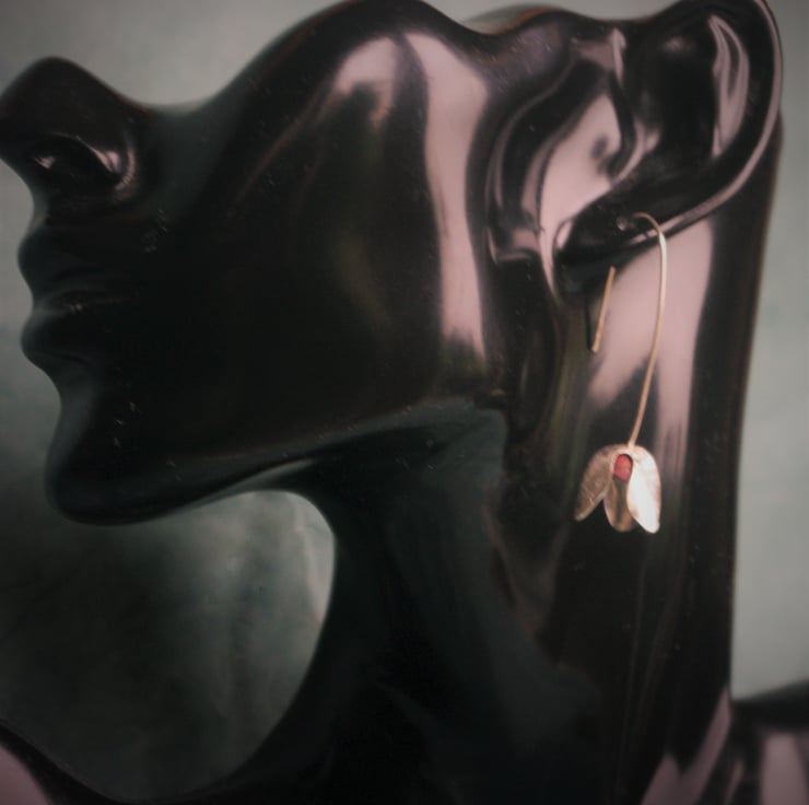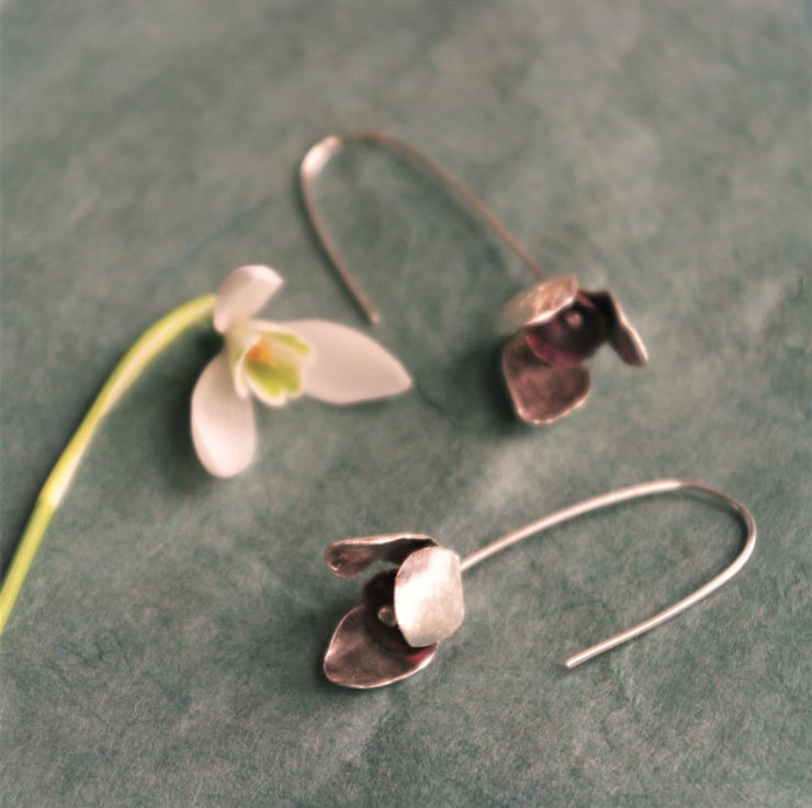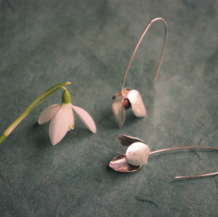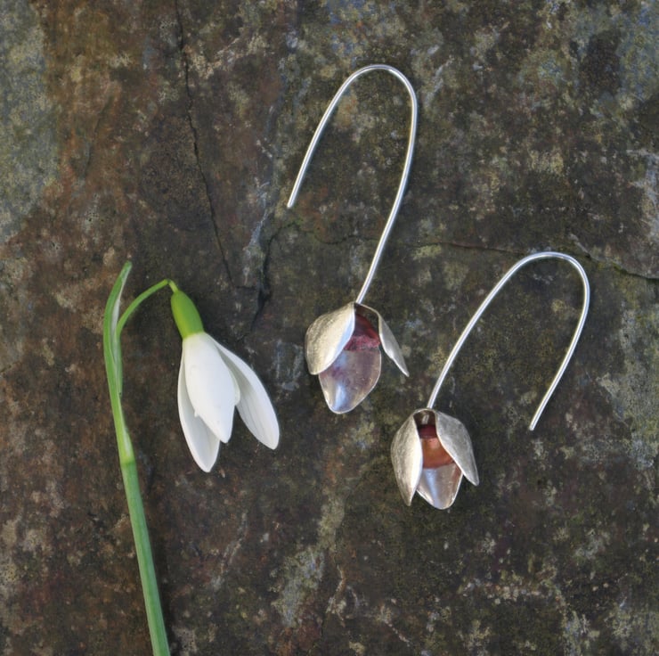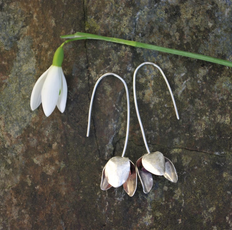 Inspired by the flower petals of a snowdrop, I have made sterling silver snowdrop earrings, cut from one piece of silver. They hang from a sterling silver, handmade ear hook with a small copper cup inside , which has a deep red tone as a result of heat.