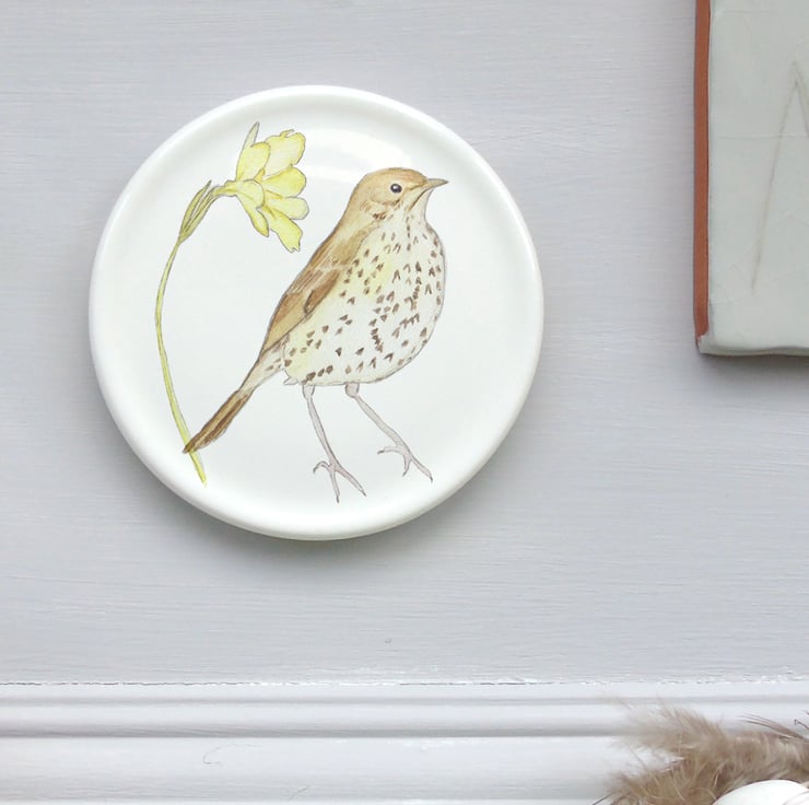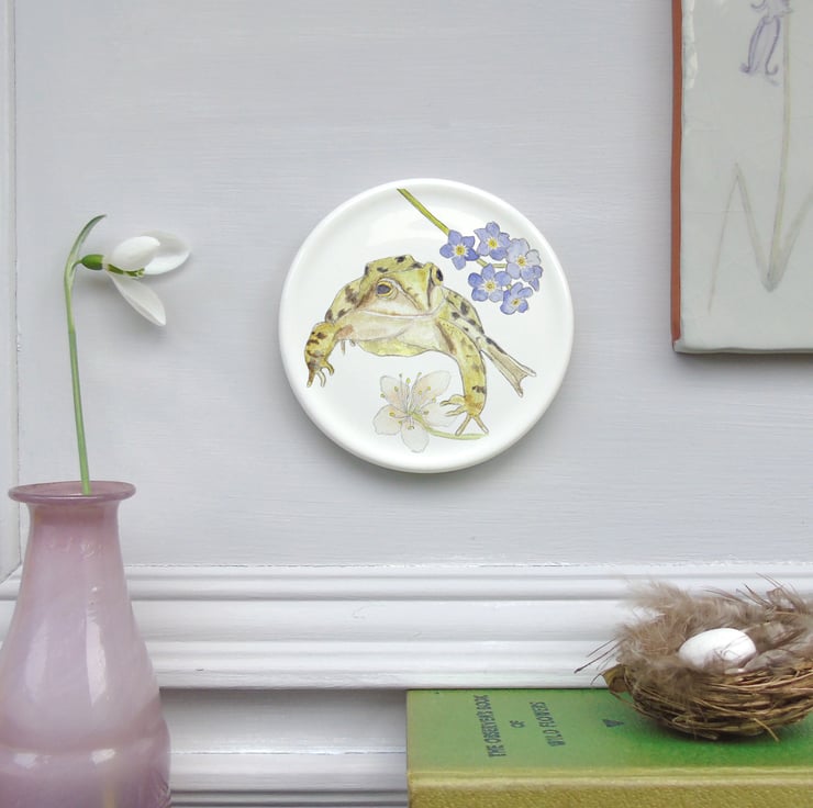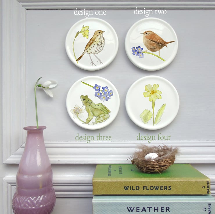 My watercolour paintings of a songthrush, wren, common frog, primrose and forget me nots are made into ceramic transfers and then applied by hand to each mini bone china plaque. The decorative hanging plates are then fired to 800°c meaning the designs will not scratch or fade even in direct sunlight.