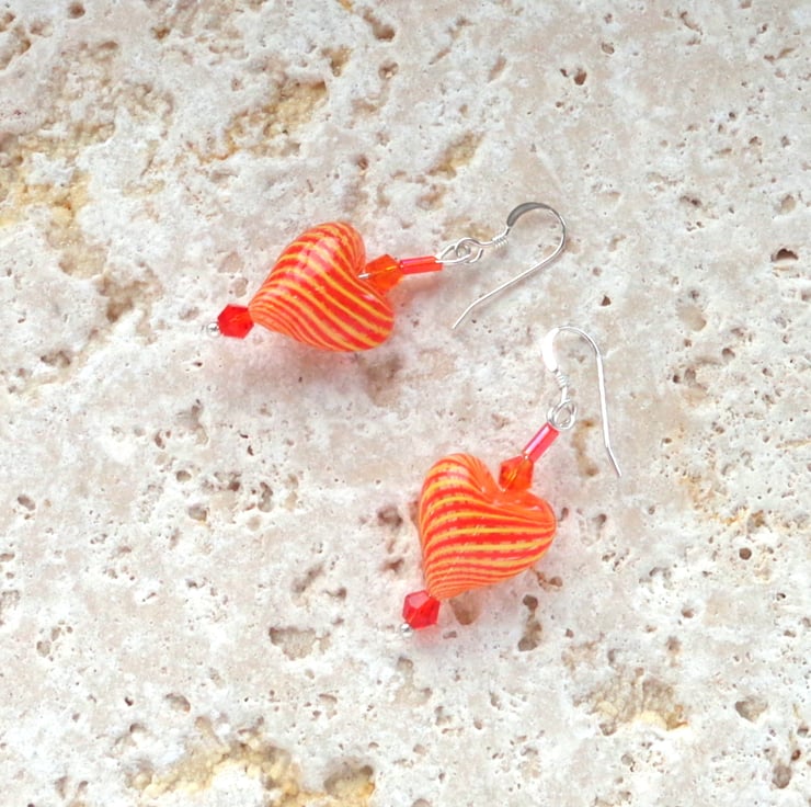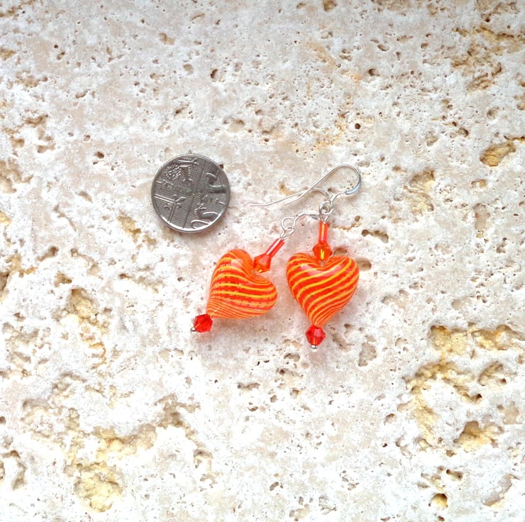 Beautiful hollow glass heart beads in a swirled orange and lemon design, mounted with orange crystals, set on silver plated pins.
