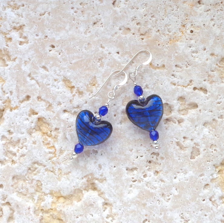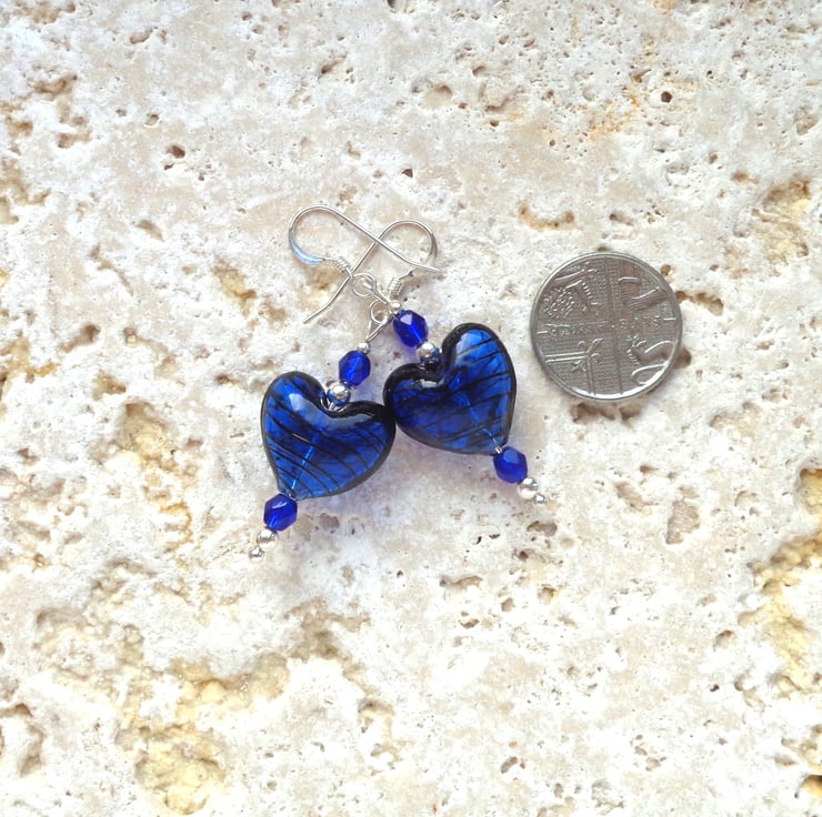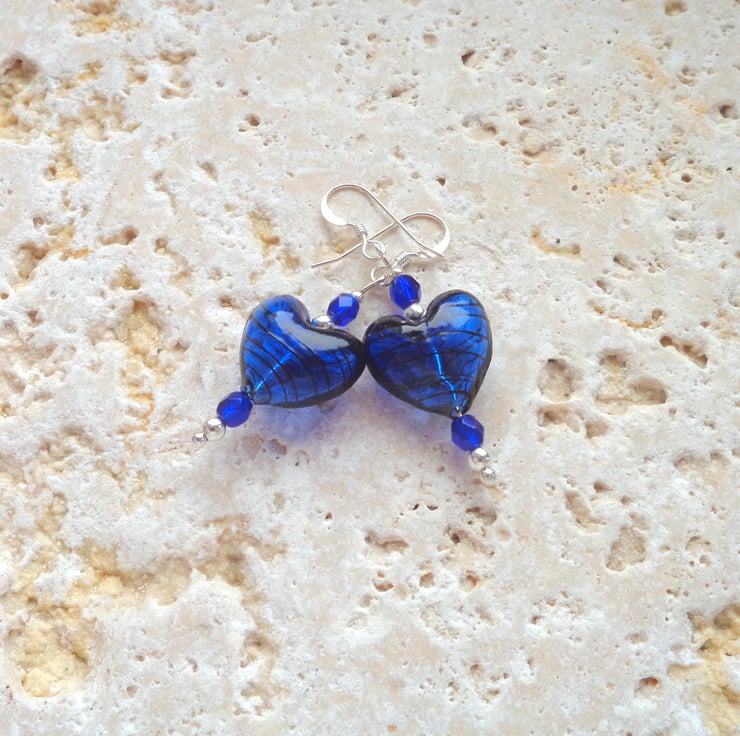 Stunning hollow glass heart beads in a swirled deep blue and black design, mounted with deep blue crystals and silver beads, set on silver plated pins.
