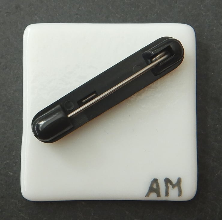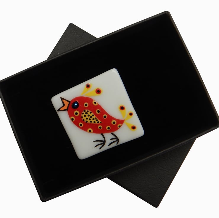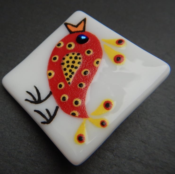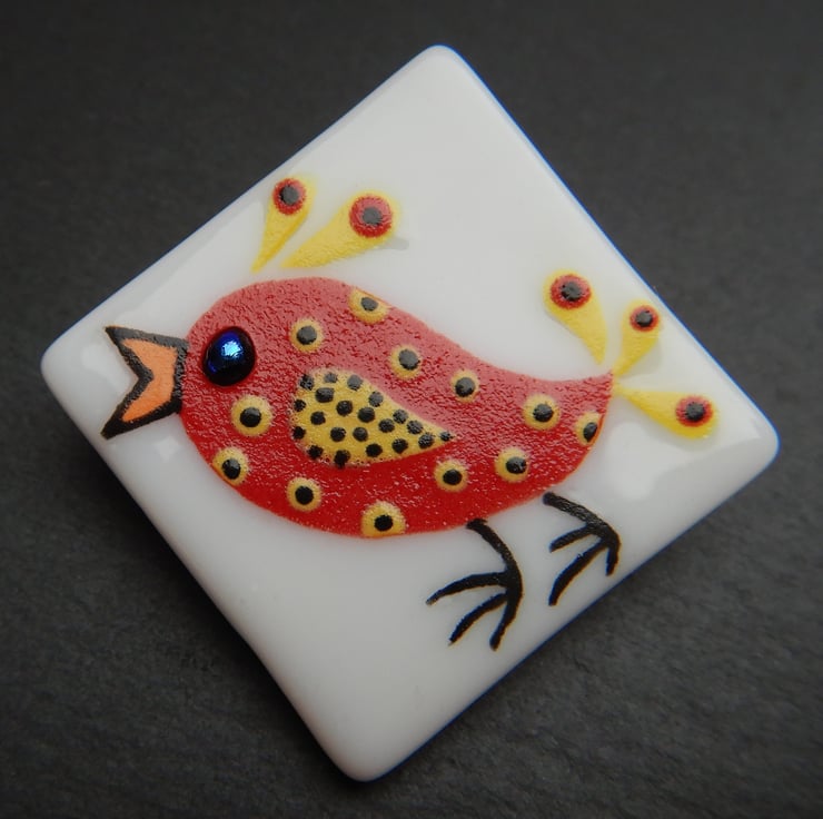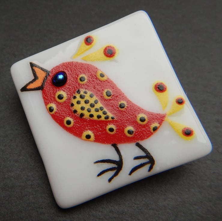 UNIQUE: Handmade Fused Glass 'LITTLE BIRD' Brooch. 'LITTLE BIRD' has been very carefully hand painted onto the surface of the white glass backing. No paint has been used but instead it is very finely ground fusing glass mixed with water. At this stage the blending of colours and adding of details was possible. The eye of 'LITTLE BIRD' is made from metallic dichroic glass.The brooch was then fired in my kiln and the powdered glass and background fuse to become one piece.