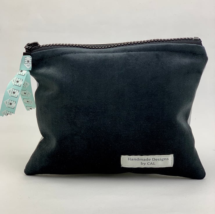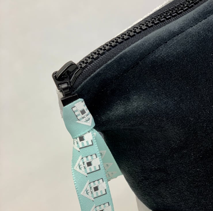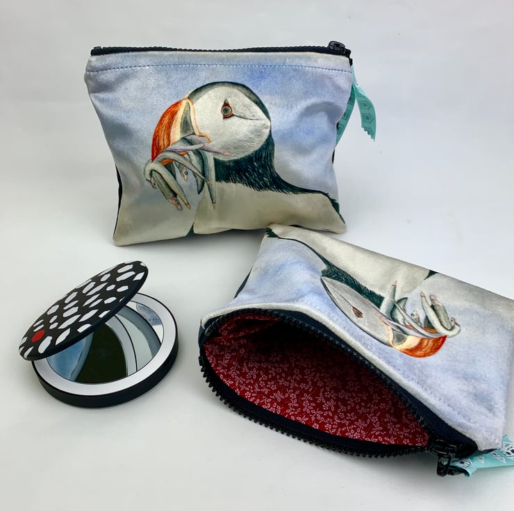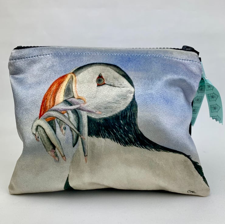 My puffin watercolour has been printed onto shimmer velvet to make this gorgeous pouch. With a black velvet on the reverse this feels truly luxurious. Fully lined with cotton and closes with a chunky plastic zip complete with a beach hut ribbon zip pull. Measuring at approx 7 x 5 inches it is an ideal shape to keep on your bag. It’s uses are endless!