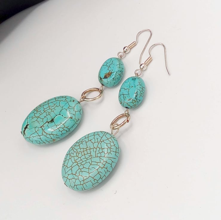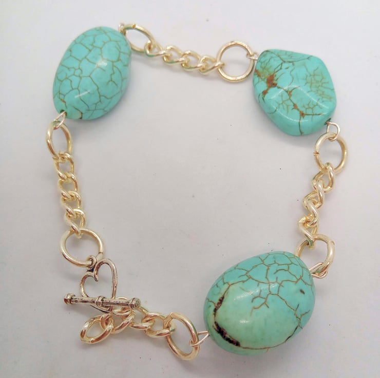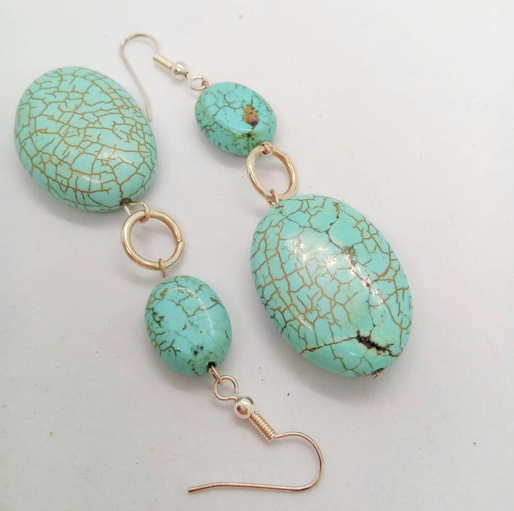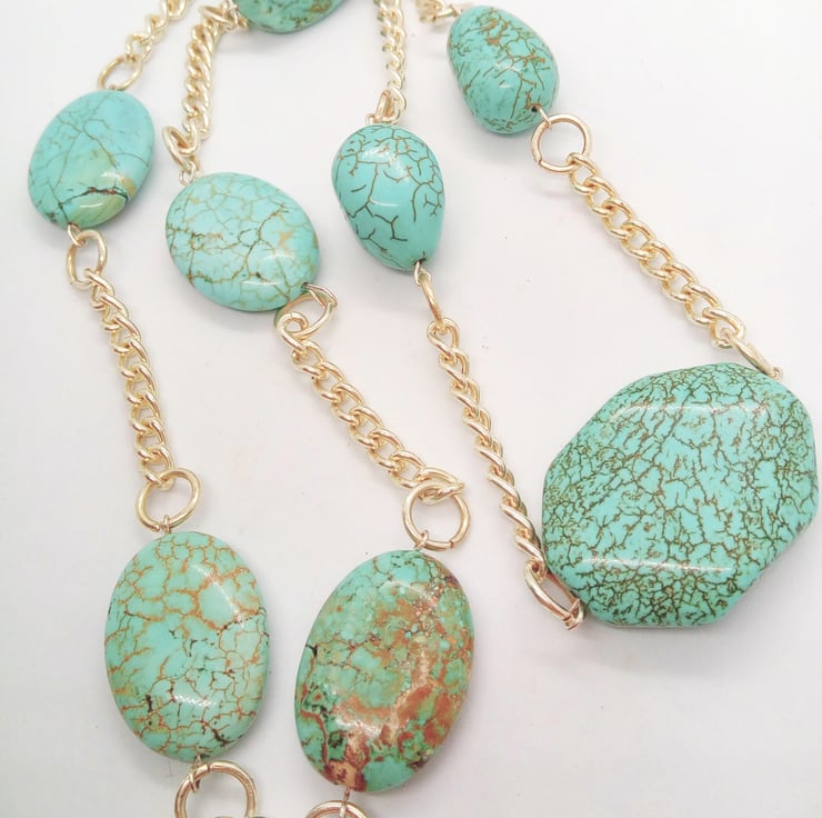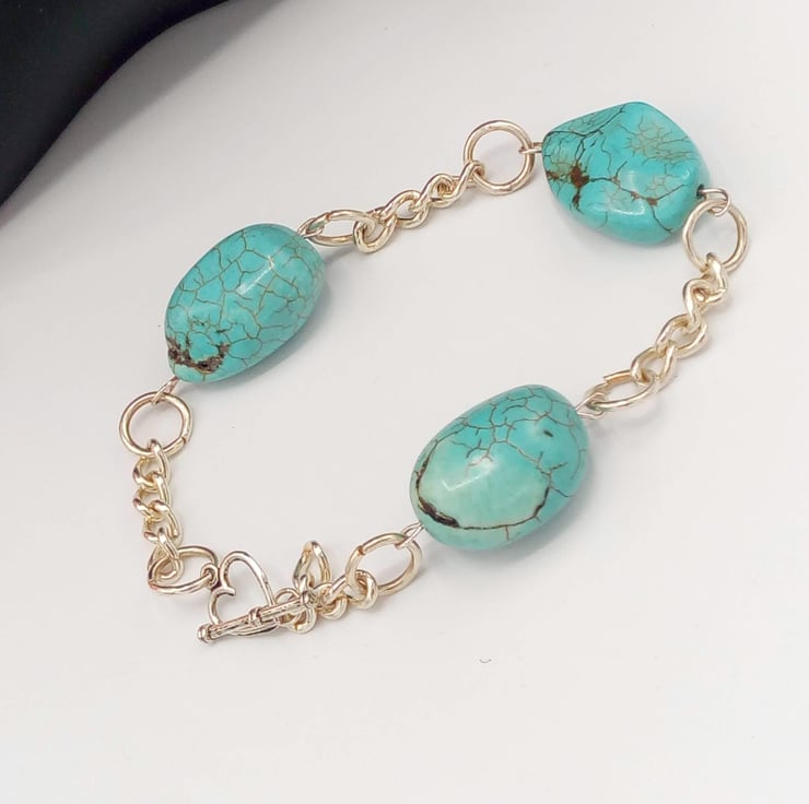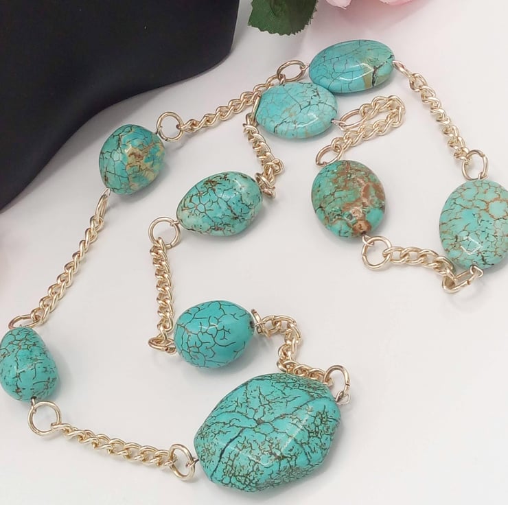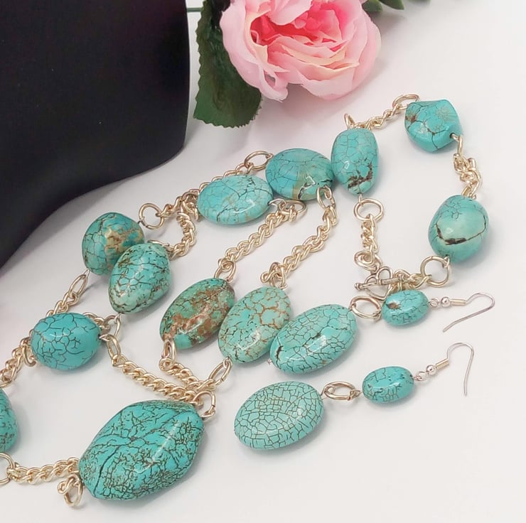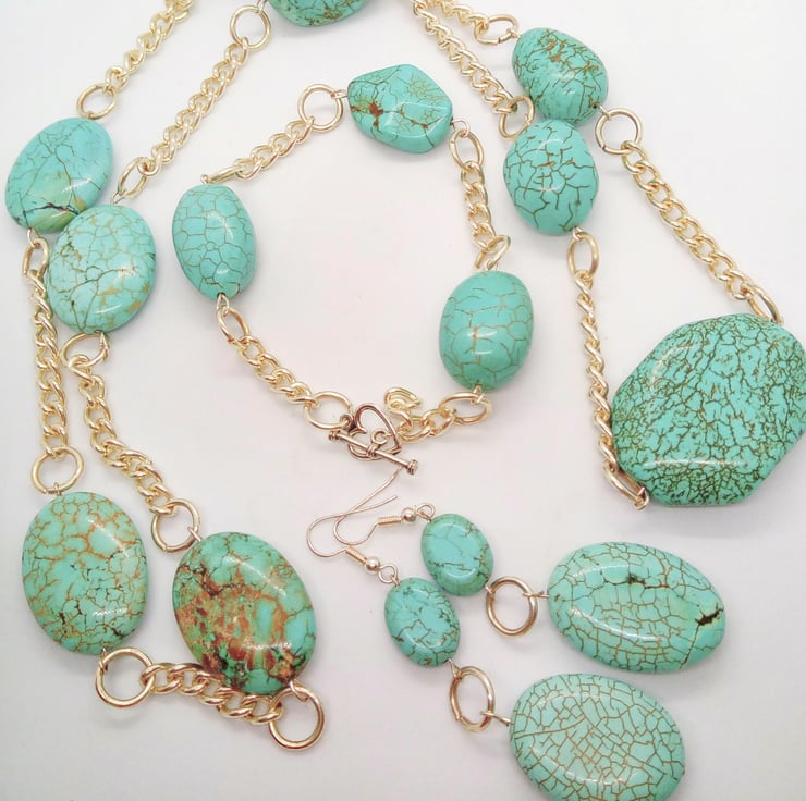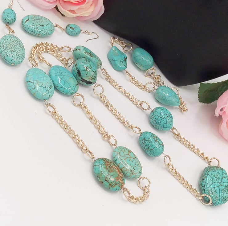 This gorgeous jewellery set comprises a longline necklace, a bracelet and a pair of earrings for pierced ears. It is made using an assortment of large turquoise beads linked together with silver plated chain. The beads measure 32 mm x 25 mm oval beads, approx. 30 mm x 22 mm nugget beads with a 40 mm x 30 mm turquoise beads at the centre. The necklace is long enough to fit over your head without the need for a clasp, and the earrings have silver plated ear wires.