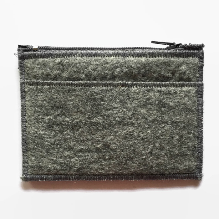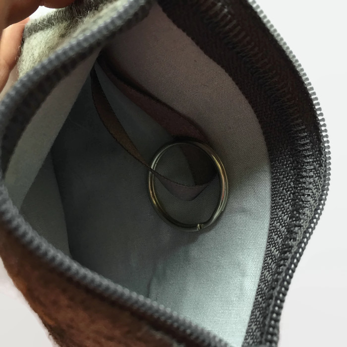 The felt for this coin purse has been hand made using grey woollen fibres and a wet felting method. Three yellow daffodils have been needle felted to the front and it has been sewn up into a coin purse. A keyring is attached to the inside by means of a grey ribbon. The purse is lined with light grey polycotton fabric and has a grey zip on the main compartment. On the reverse an extra external pocket has been added.