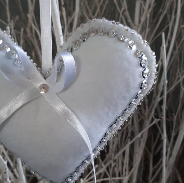 Heart hanger made using white felt, silver sequins, silver seed beads and white ribbon.