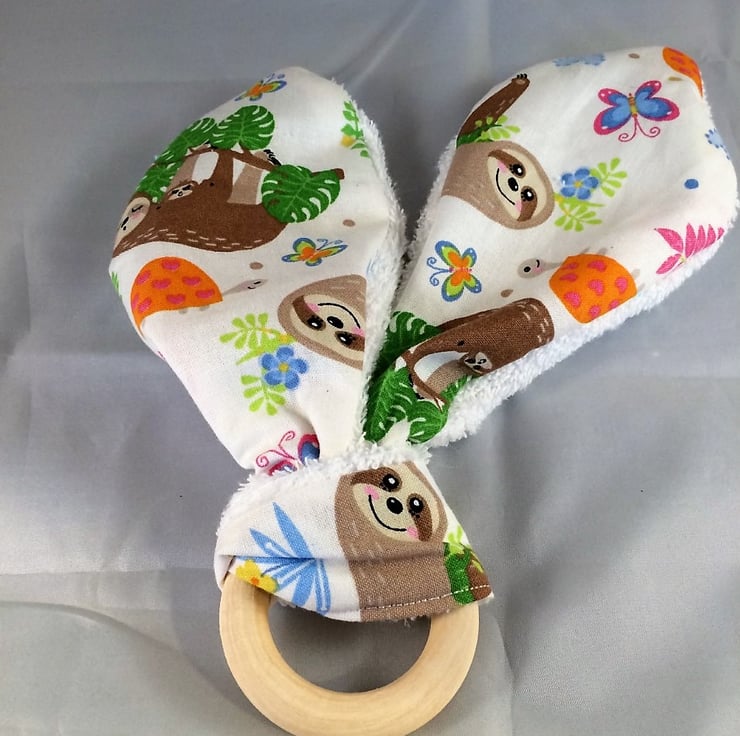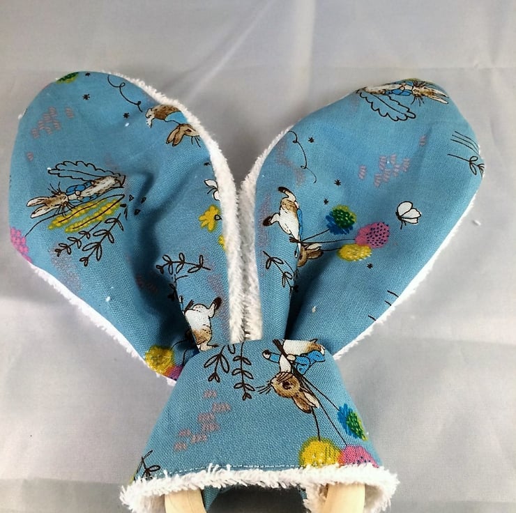 These lovely teether,s are made from cotton and backed with terry toweling with a natural wooden teething ring great for the little ones who are cutting teeth, the toweling makes them very absorbant the ears nice and big to mop up all that dribble,