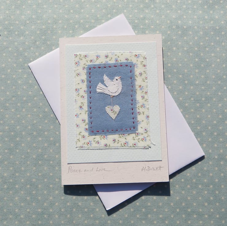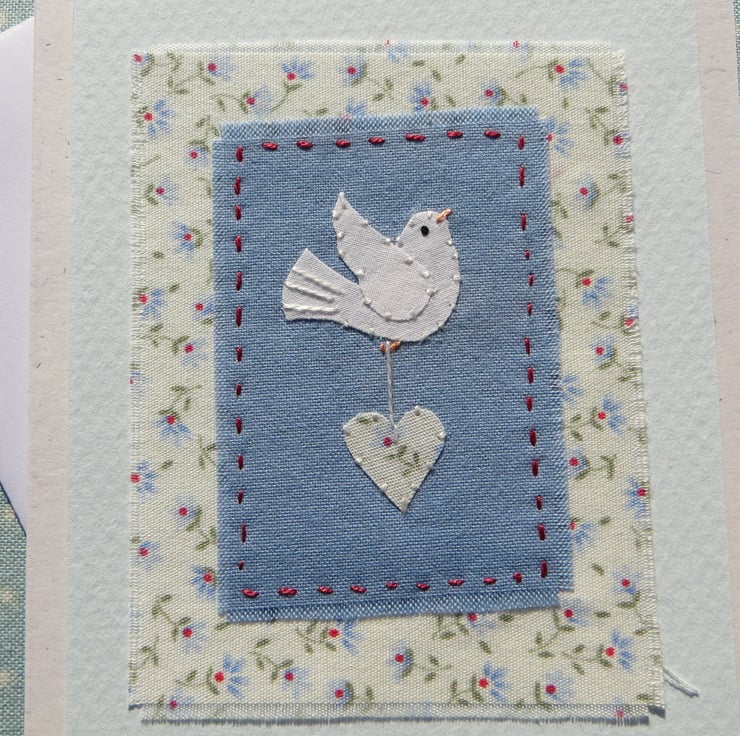 This little applique dove and heart design is made up of very pretty cotton print fabric teamed with a piece of recycled white cotton for the dove motif. Everything cut and stitched by hand to make a unique and lasting original piece of textile art. Perfect for new baby, first birthday, Christening or to go with baby shower gift. Suitable for weddings or engagement too!
